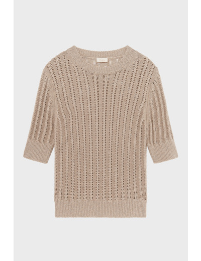 Fabriqué en Italie avec un fil italien de qualité, ce pull présente une longueur standard et une maille unie à lurex dans une finition ajourée. La forme droite, le col rond et les manches courtes complètent ses caractéristiques techniques pour un vêtement durable et élégant.