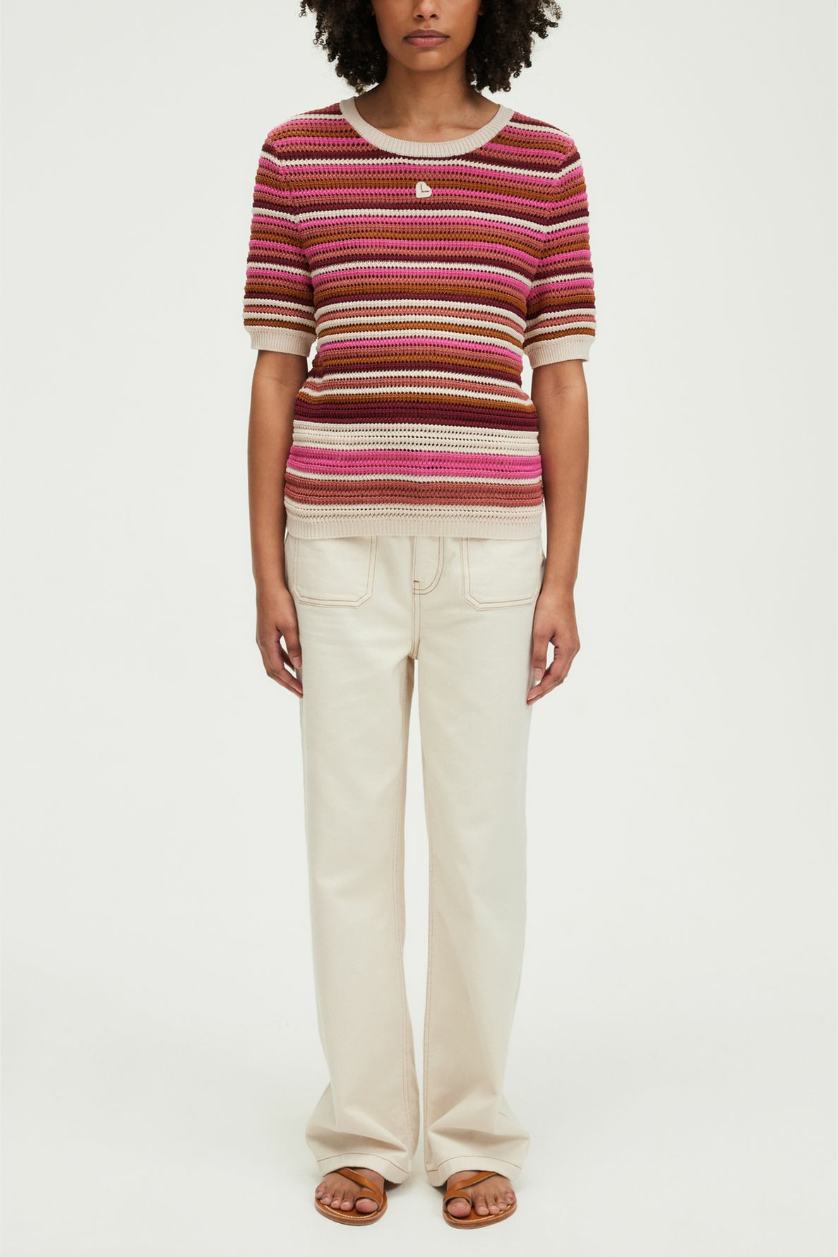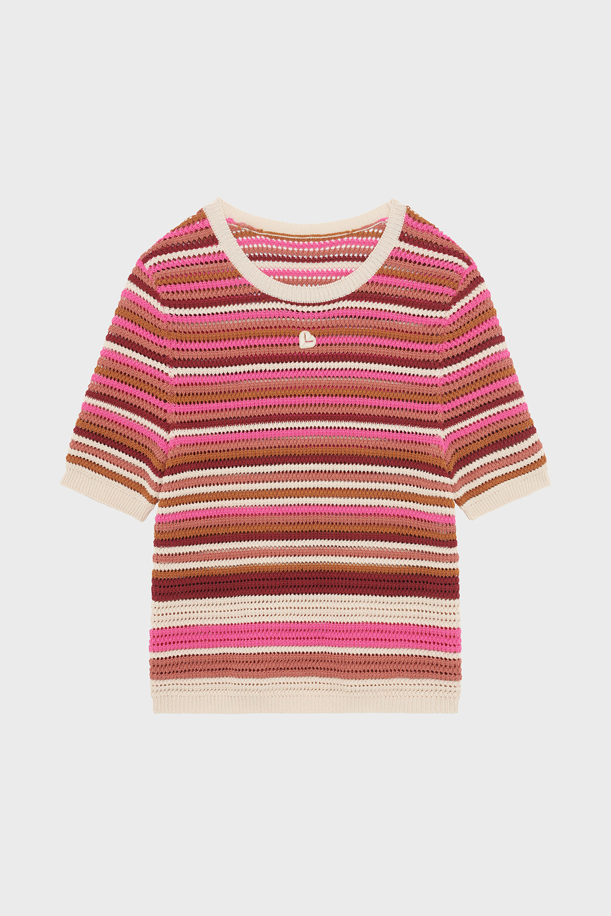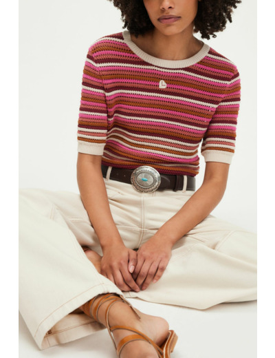 Forme droite, manches courtes, col rond, maille stretch ajourée, motif rayé multicolore, logo brodé sur le devant.
