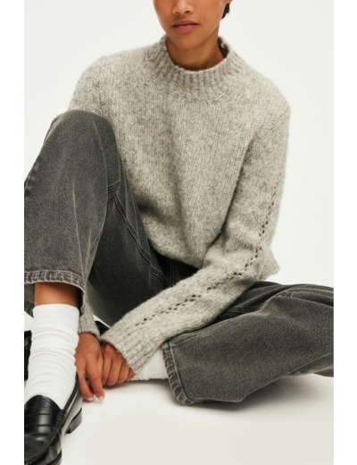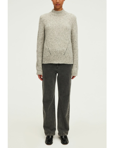Fabriqué en Italie, ce pull se compose d’un mélange uni de laine et d’alpaga, avec une forme droite, des manches longues, un col montant et des emmanchures basses. Les jeux de maille ajourés et les finitions bords-côtes témoignent d’un savoir-faire soigné et d’une attention portée aux détails.