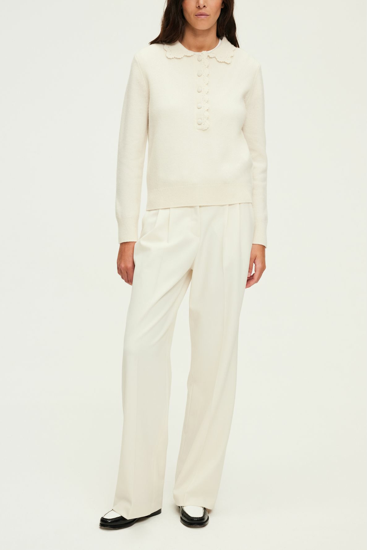 100% laine unie, forme droite, col polo fermé par cinq boutons ronds, manches longues, broderies au col et le long de la patte de boutonnage, finitions bords-côtes. La mannequin mesure 180 cm et porte une taille 2.