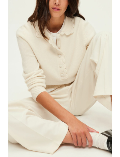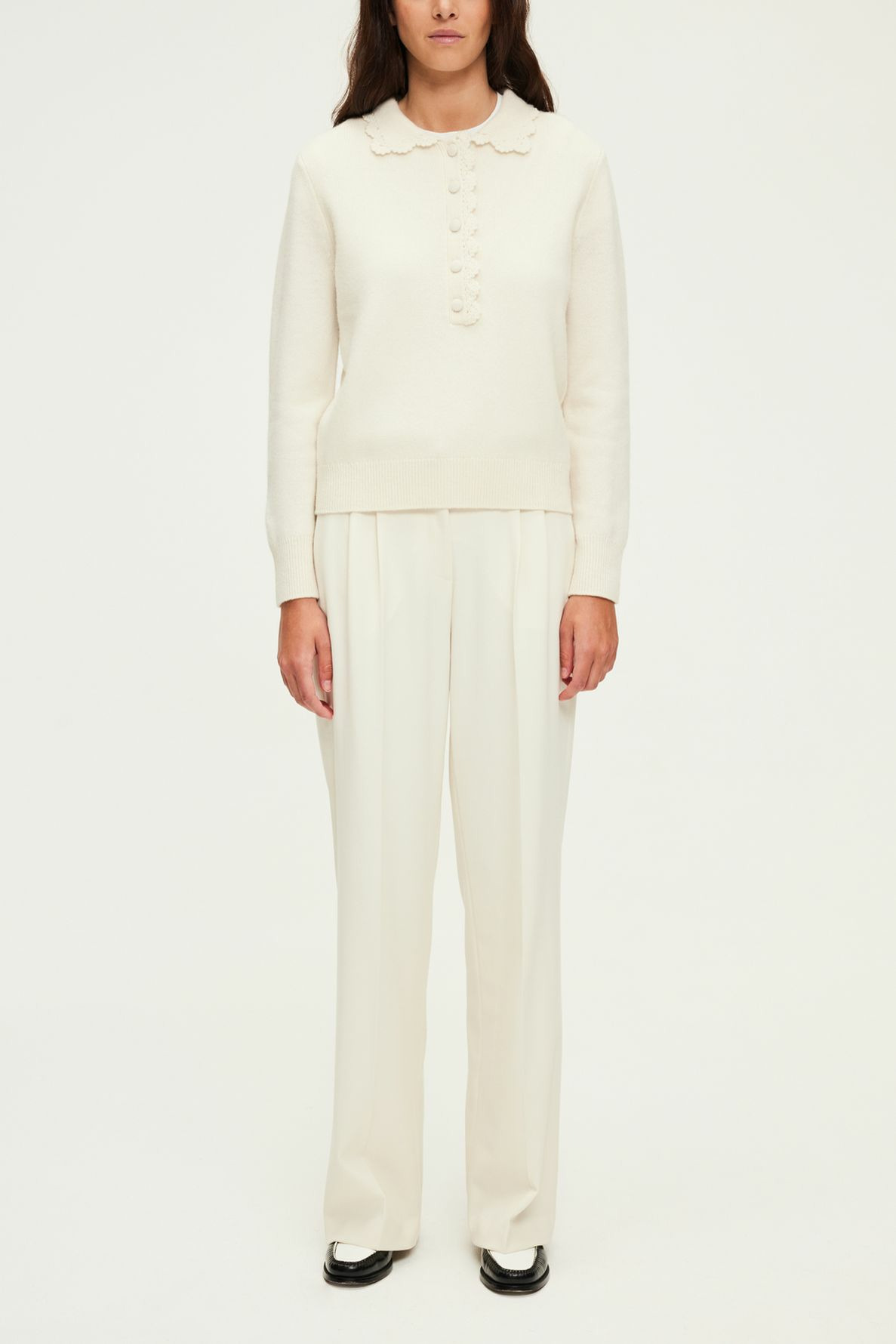 Forme droite. Laine unie. Col polo. Manches longues. Encolure fermée par cinq boutons ronds. Broderies au col et le long de la patte de boutonnage. Finitions bords-côtes. La mannequin mesure 180 cm et porte une taille 2.