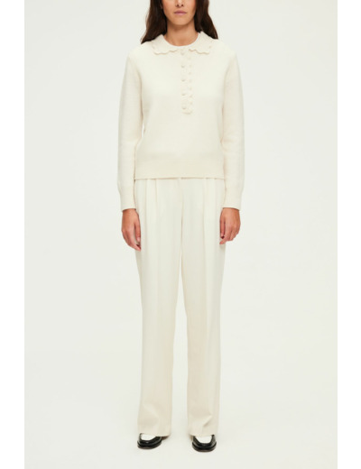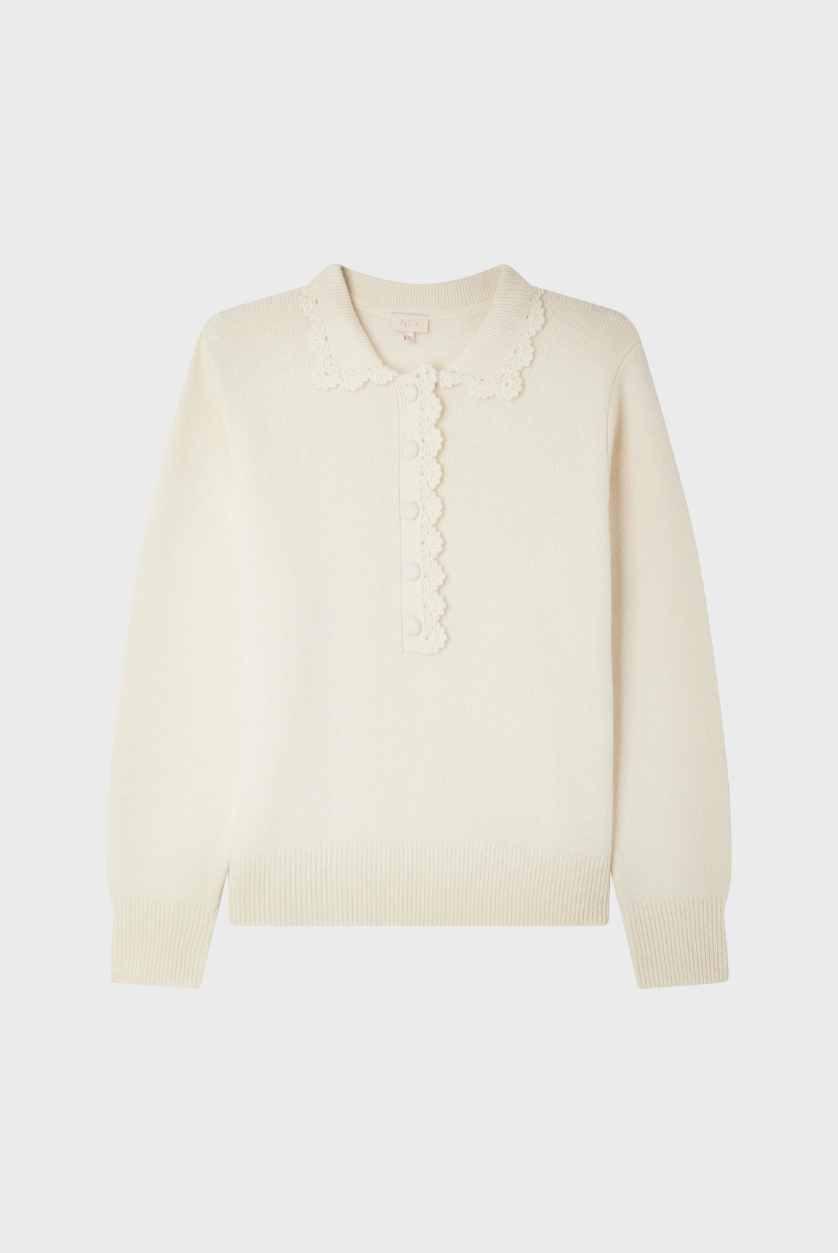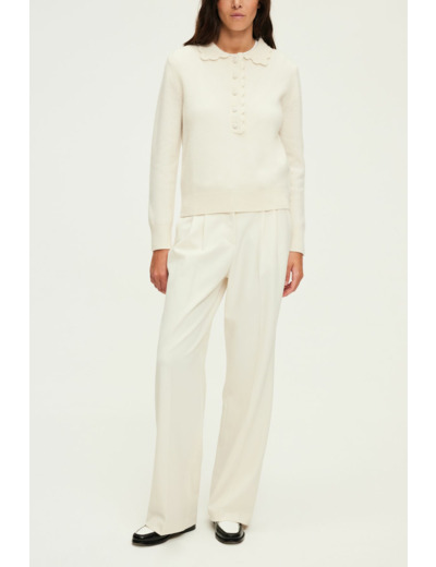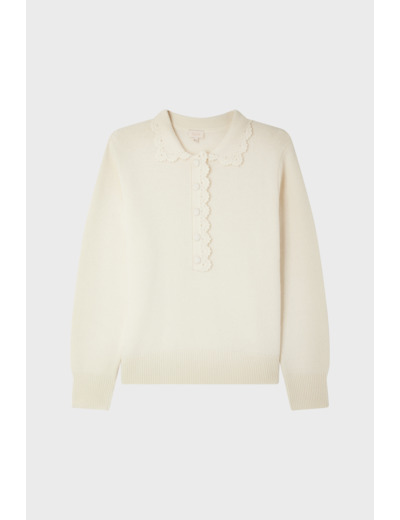 Un pull polo en laine écrue qui allie élégance intemporelle et confort naturel. Chaque détail brodé souligne une finition soignée pour un style affirmé.