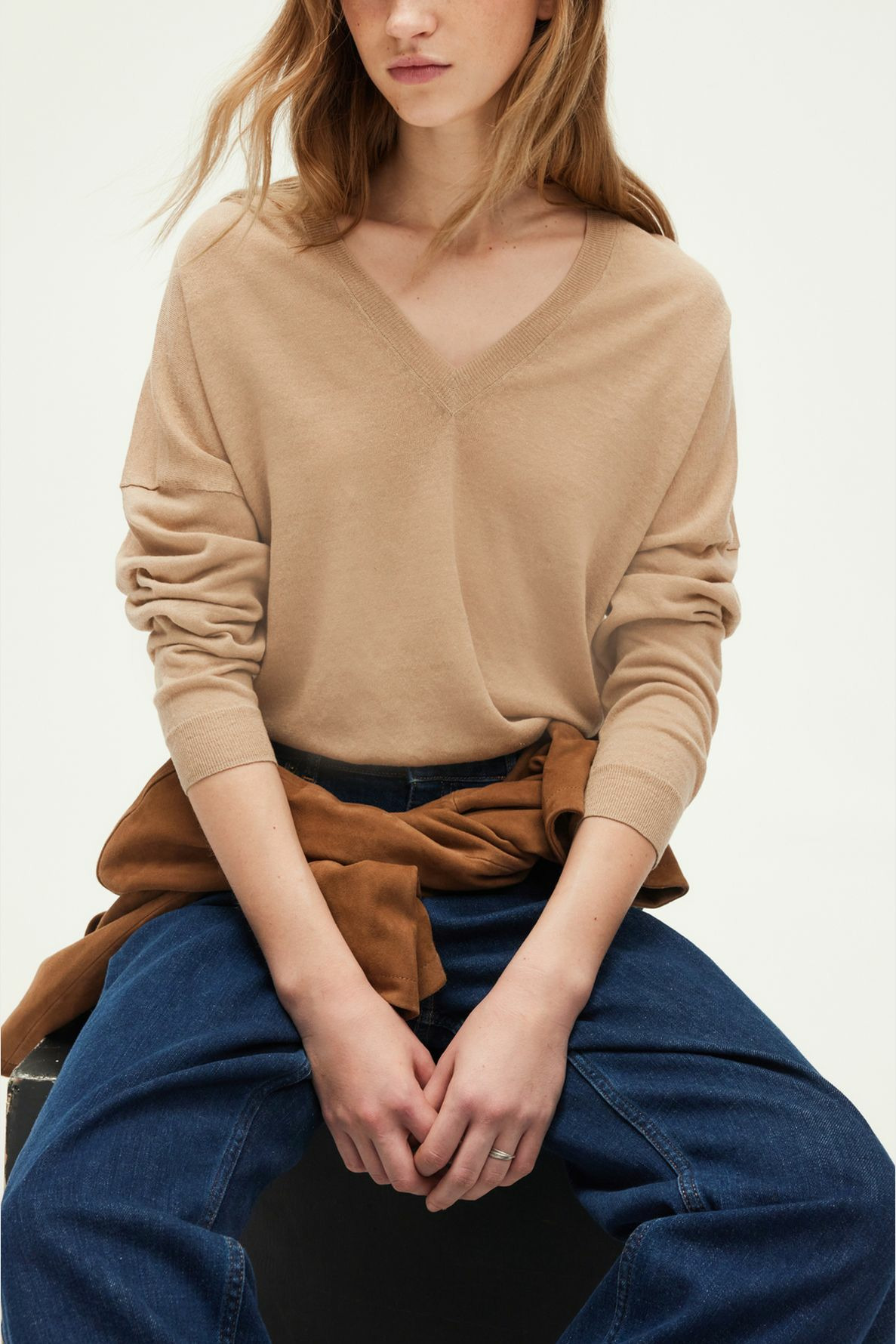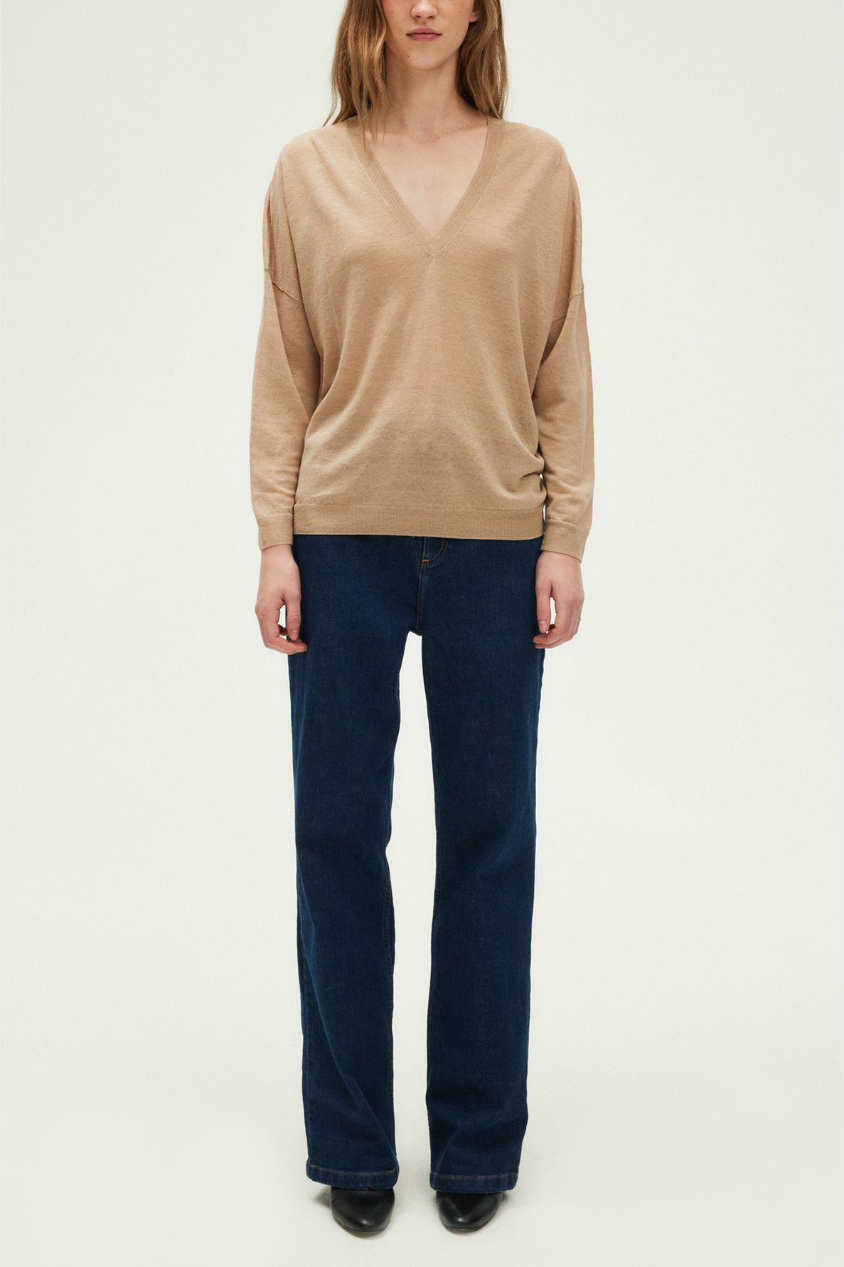Fabriqué en lin uni de qualité italienne, ce pull présente un col V classique, des manches longues, une emmanchure basse et une coupe droite et large. Sa longueur standard s’adapte à toutes les morphologies pour un porté fluide et moderne.