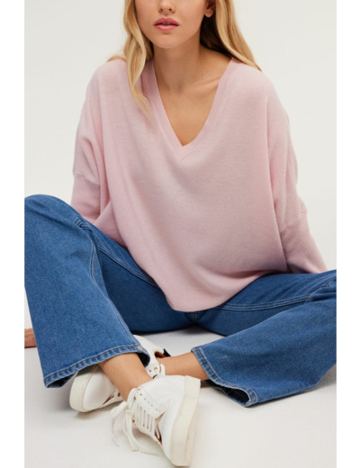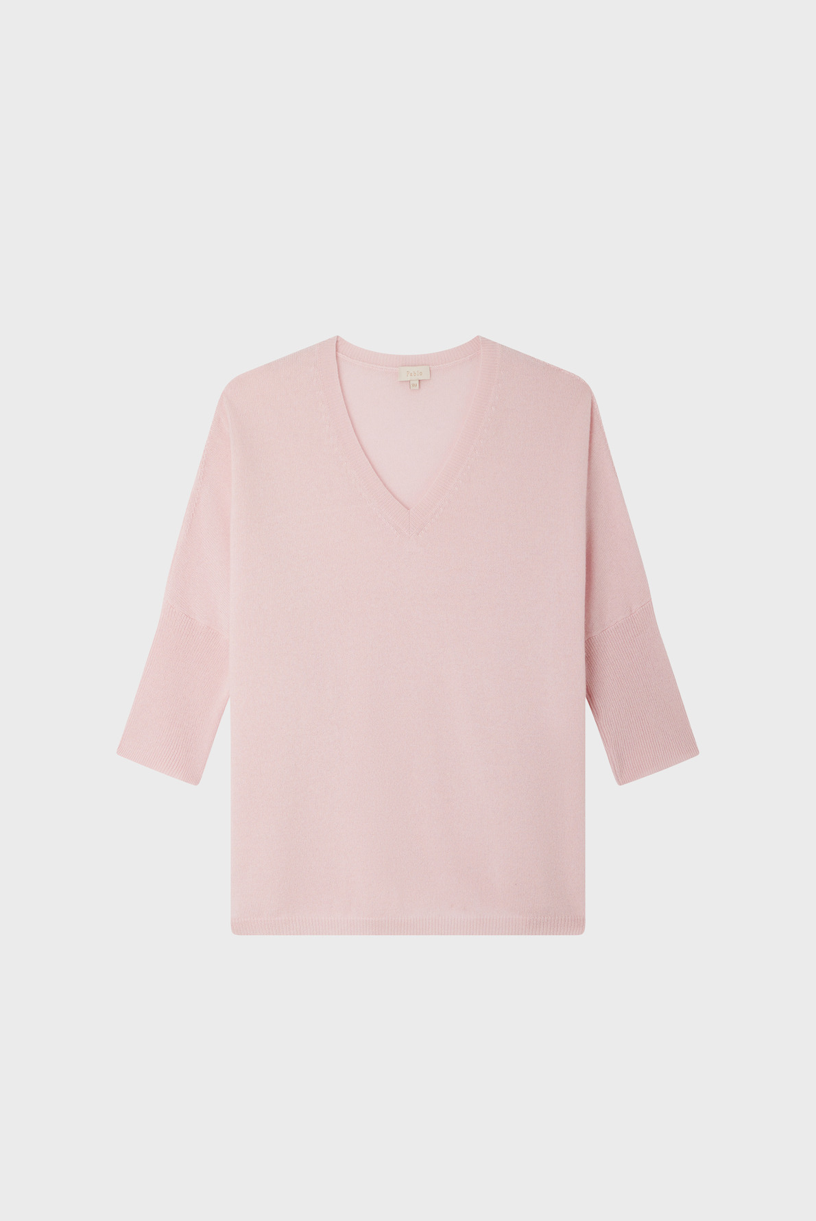 Pull en 100% cachemire uni, forme oversize, col V, manches 3/4, finitions bords-côtes avec bas de manche resserré, longueur standard. La mannequin mesure 172 cm et porte une taille unique.