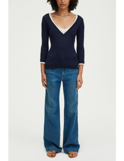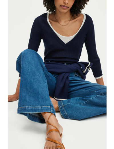 Sublimez votre allure avec ce pull col V en maille à côtes, alliant élégance et modernité. Sa superposition en trompe-l’œil apporte une touche unique à votre dressing.