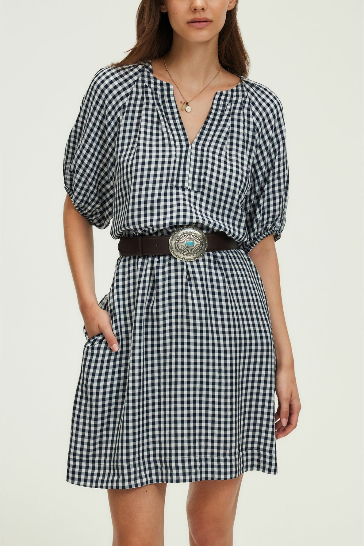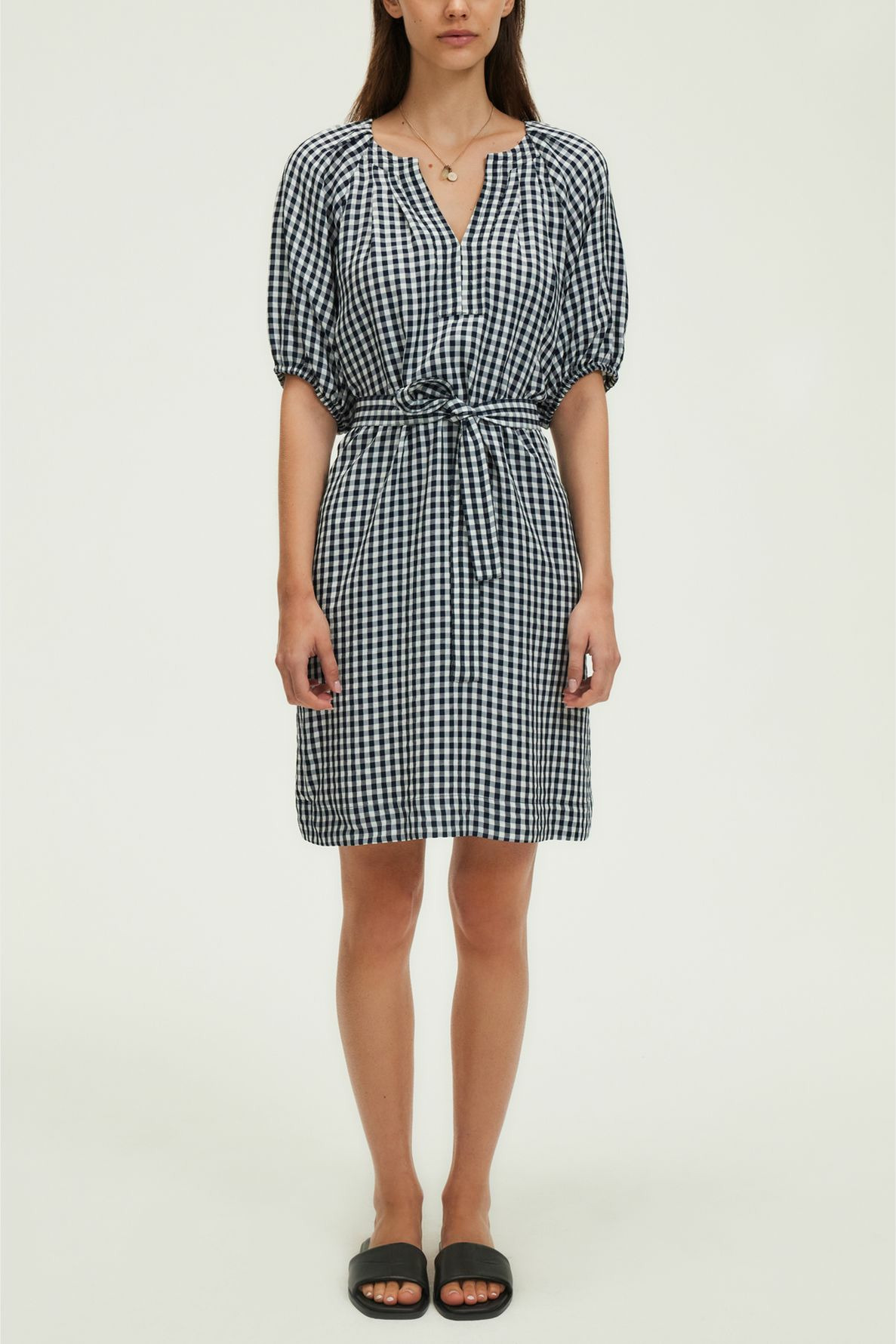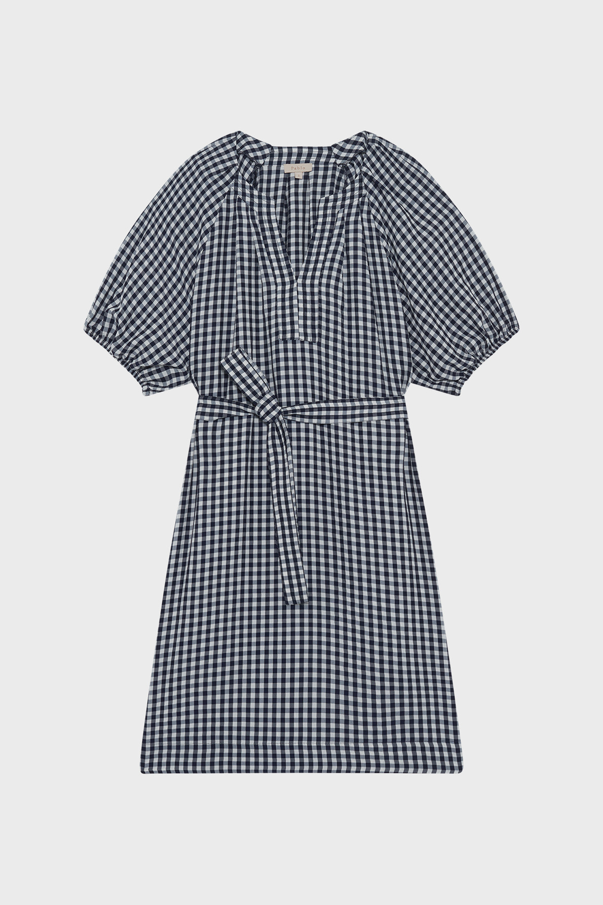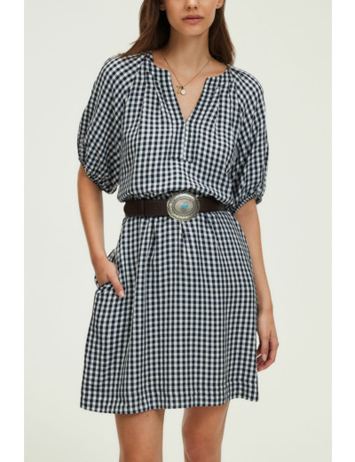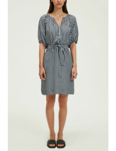 Fabriquée en tissu légèrement gaufré, la robe présente un motif à petits carreaux Vichy bleu marine et blanc. Elle se distingue par une emmanchure raglan, un col rond esprit tunisien avec empiècement et surpiqûre à l’encolure, des manches courtes ballon avec bas élastiqués, ainsi que des plis plats aux épaules et en haut du dos. La ceinture amovible complète ce modèle pratique et élégant.