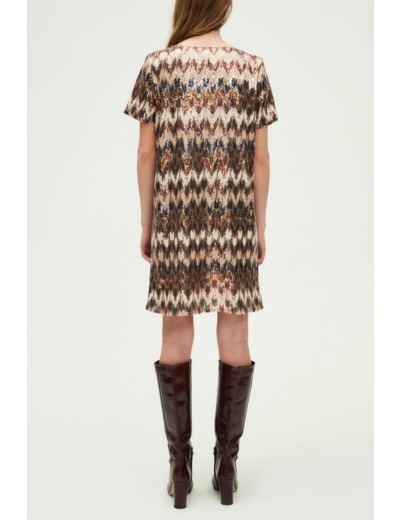 Cette robe mêle modernité et sophistication grâce à sa coupe droite légèrement évasée qui épouse la silhouette sans la contraindre. Le motif géométrique en sequins apporte une touche graphique et dynamique, tandis que le col V et les manches courtes soulignent subtilement le décolleté et les bras, pour un look à la fois chic et confortable.