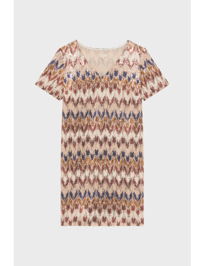 Robe courte à sequins avec motif géométrique, coupe droite légèrement évasée, col V, manches courtes. Conçue pour un port confortable et une silhouette valorisée.