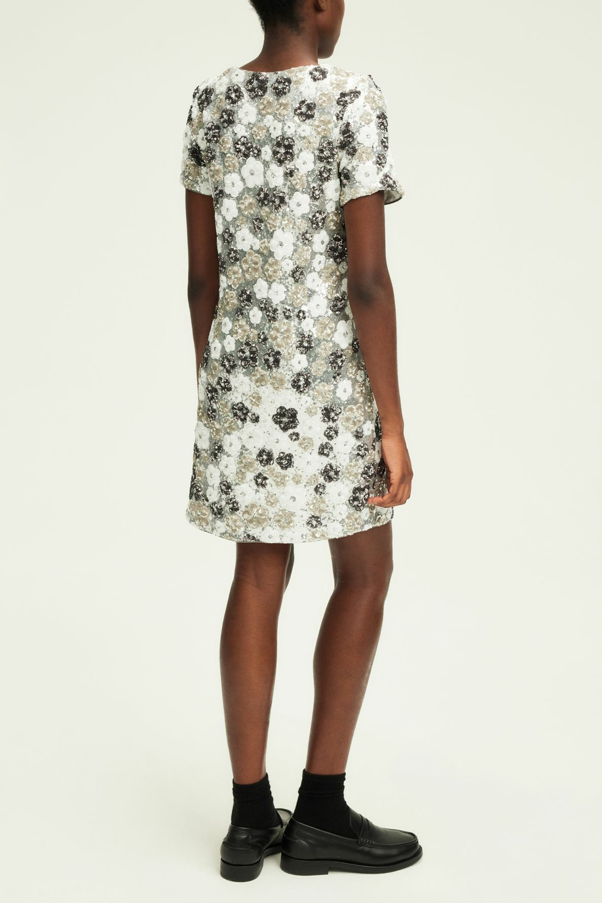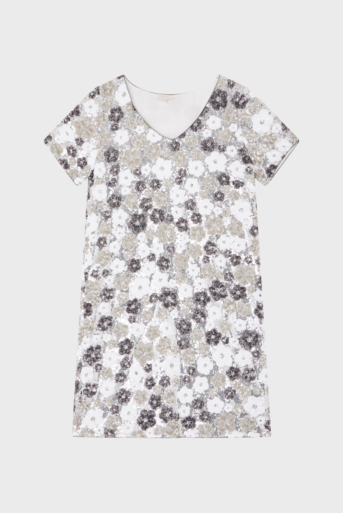 Forme droite légèrement évasée, motif floral en sequins argentés et blancs, col V, manches courtes, finitions gansées. La mannequin mesure 177 cm et porte une taille 38.