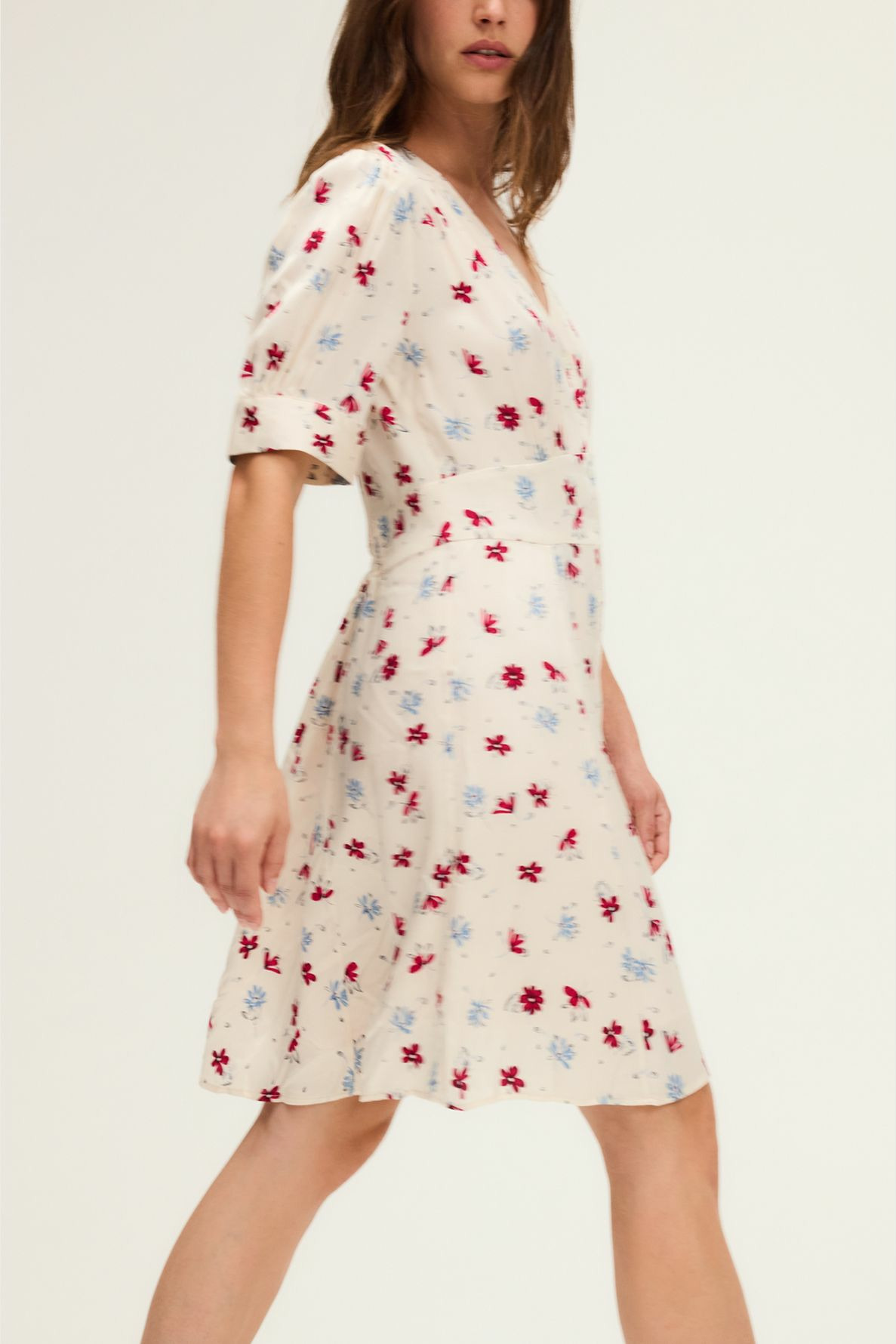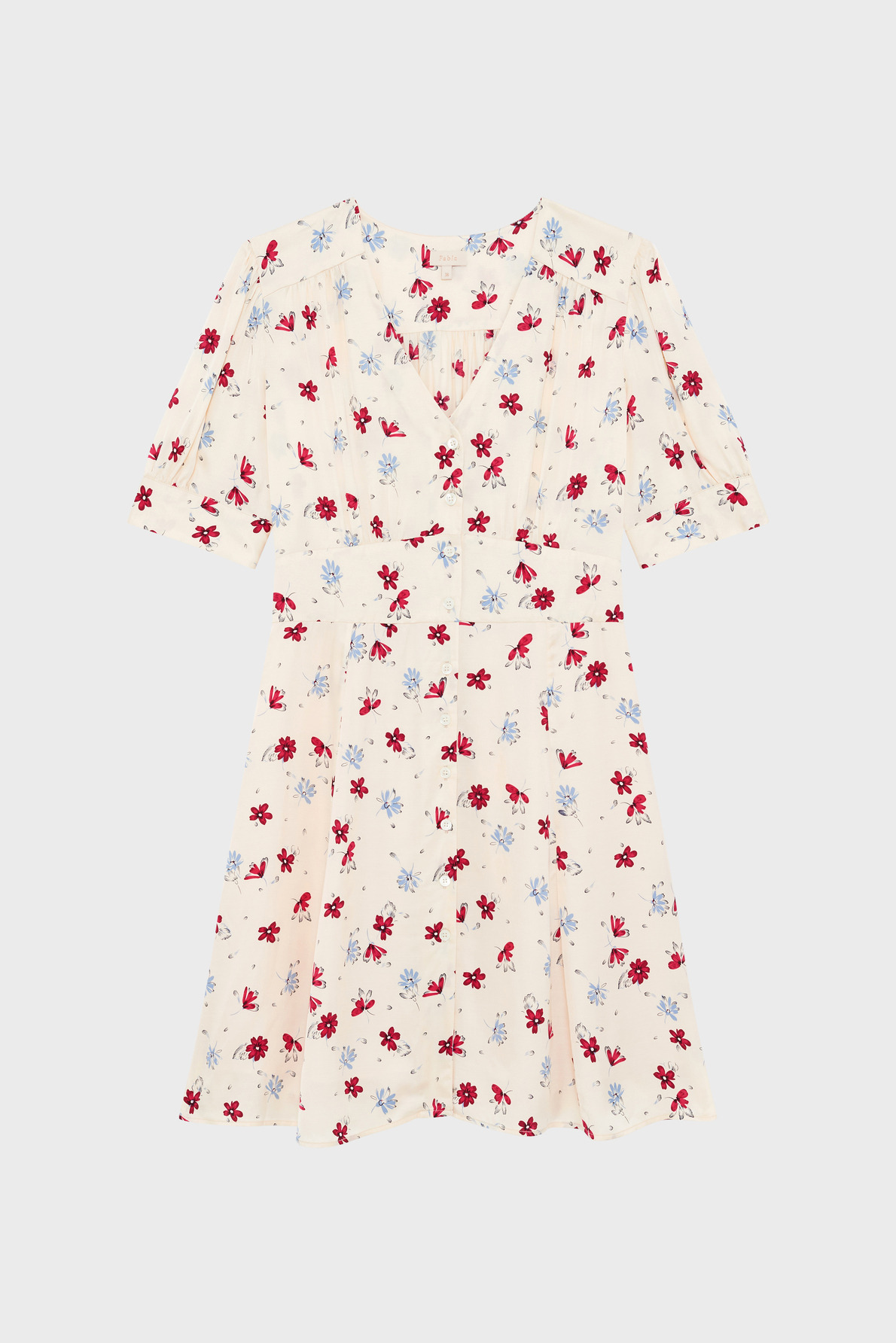 Forme cintrée avec bas évasé, motif floral sur fond écru, robe courte à col V, manches courtes avec ourlet, fermeture boutonnée sur toute la longueur, dos élastiqué smocké et empiècement en pointe à la taille.