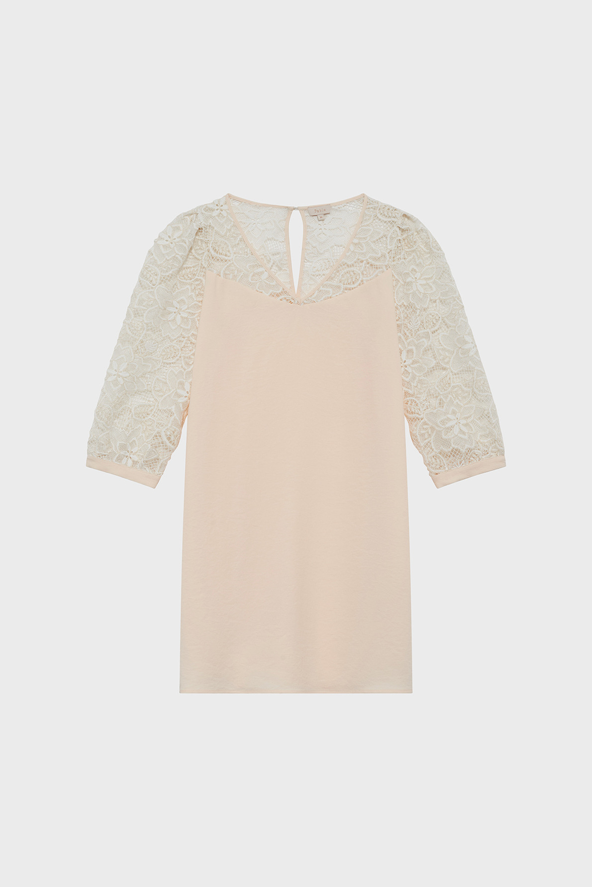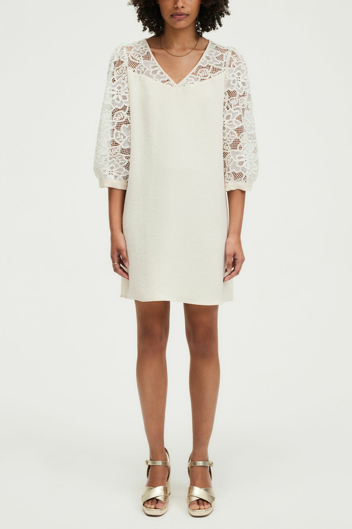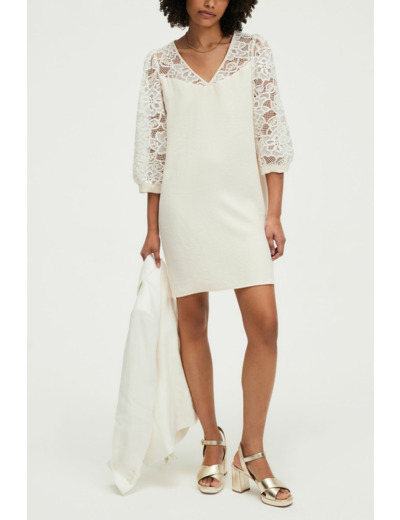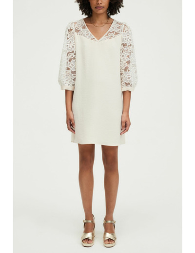 Robe courte en crêpe avec motif en dentelle sur le haut, coupe droite, col en V, manches courtes, fermeture goutte boutonnée au dos.