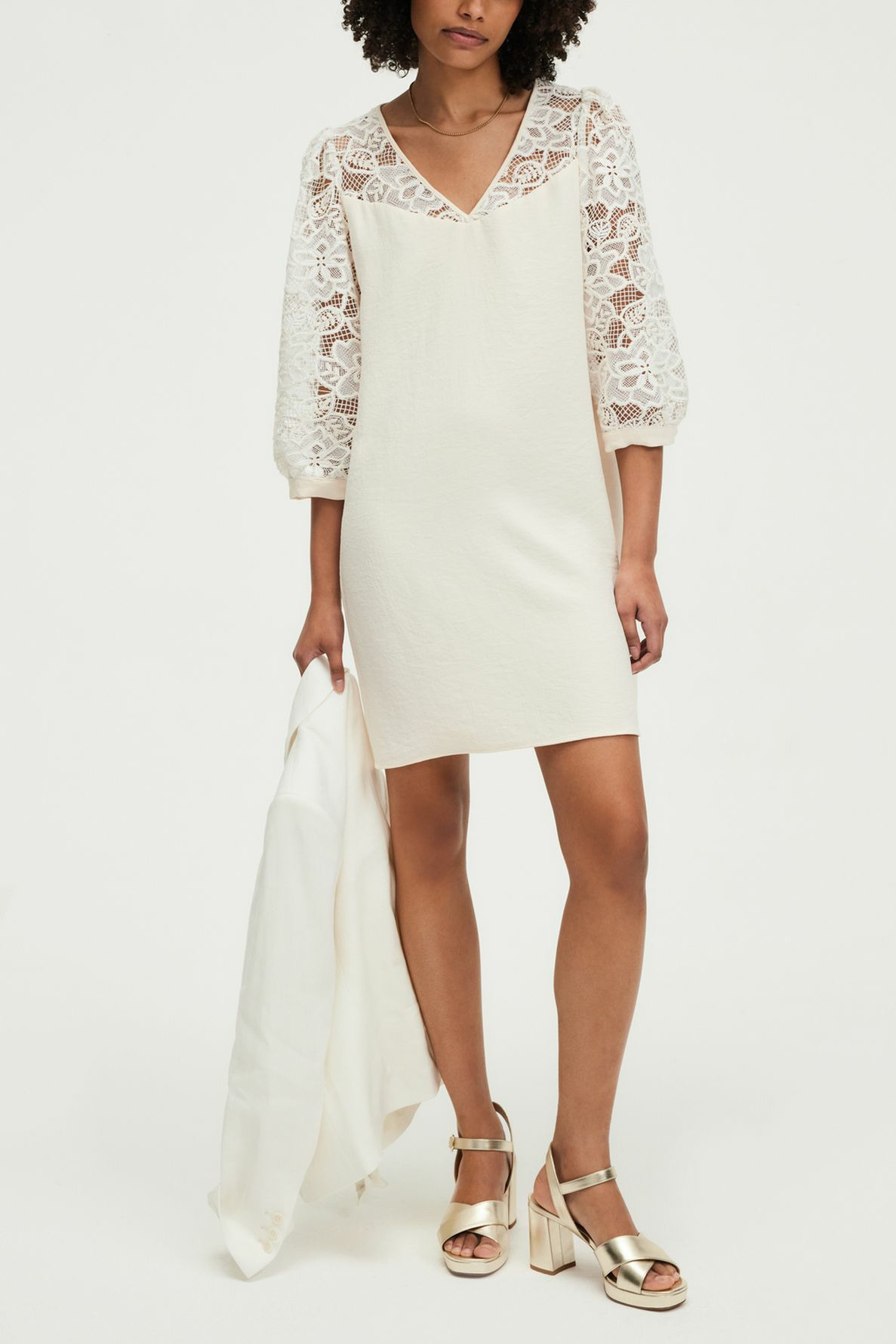 Cette robe courte structure votre silhouette avec sa coupe droite, offrant un tombé impeccable et un confort optimal. La dentelle apporte une texture raffinée qui valorise votre style, tandis que le col en V allonge visuellement le cou pour une allure élancée. Facile à associer, elle s’adapte aussi bien à des escarpins qu’à des accessoires plus audacieux.