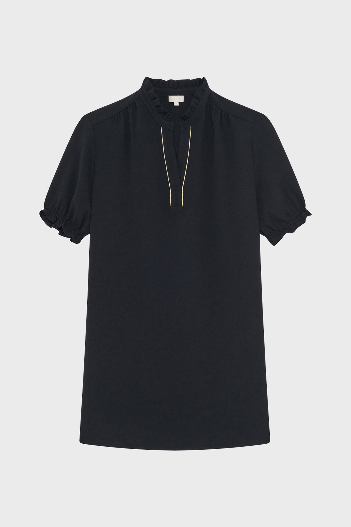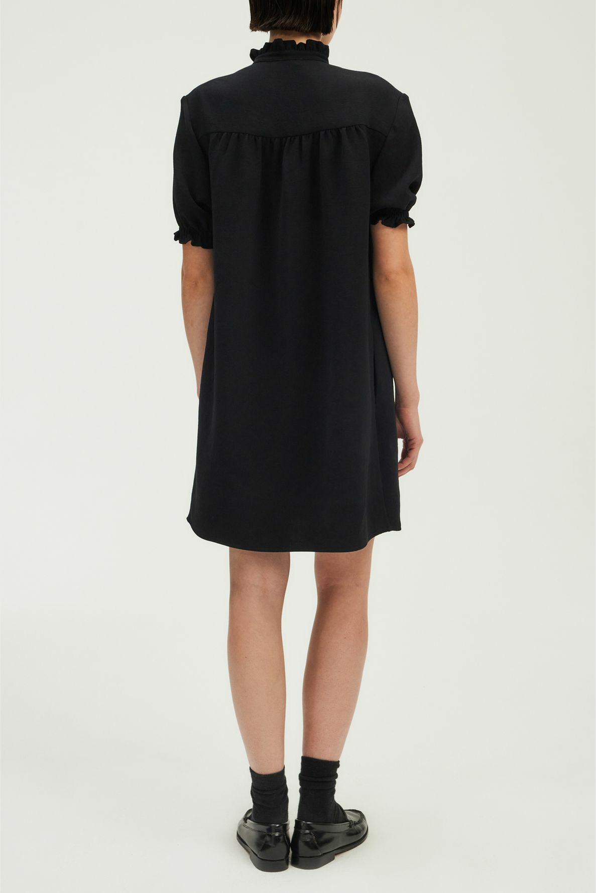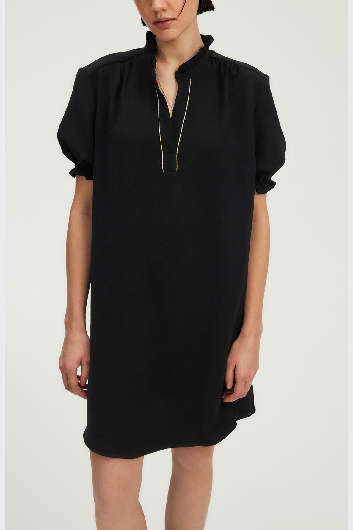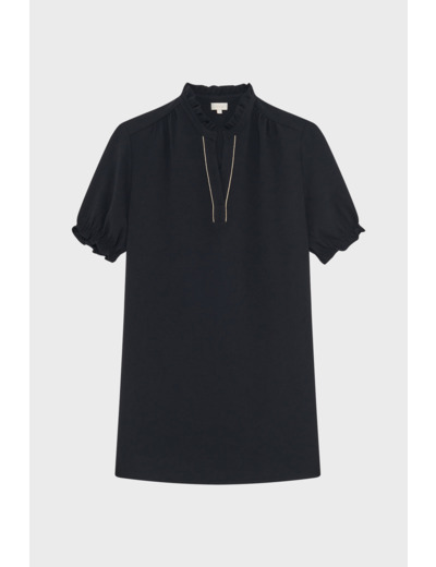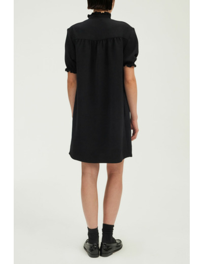 Robe courte en crêpe uni, forme droite et large, col montant à volants avec galon doré à l’encolure, manches courtes avec bas élastiqué et volanté, poches insérées dans les coutures, plis décoratifs sur le devant des épaules et empiècement plissé dans le dos.