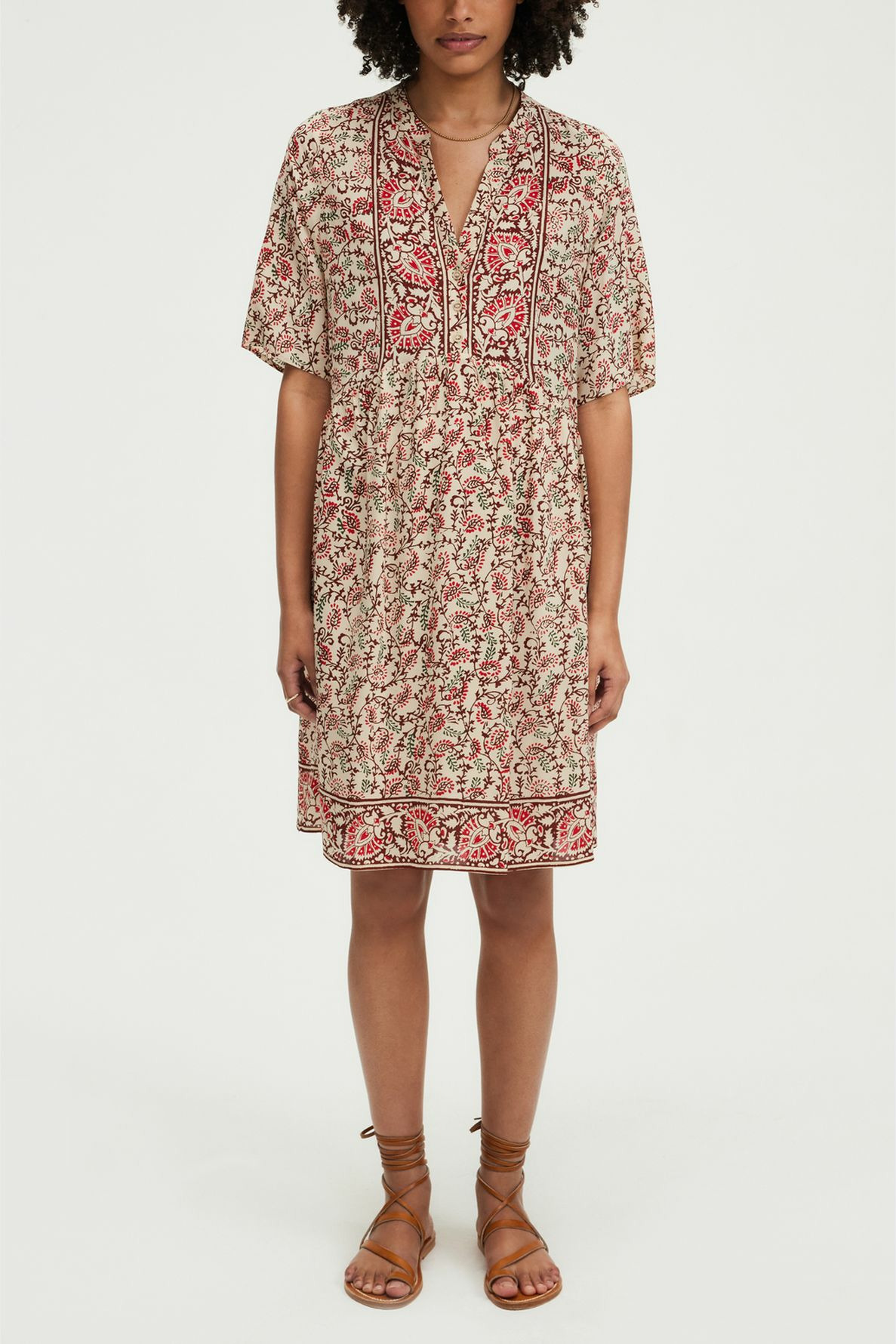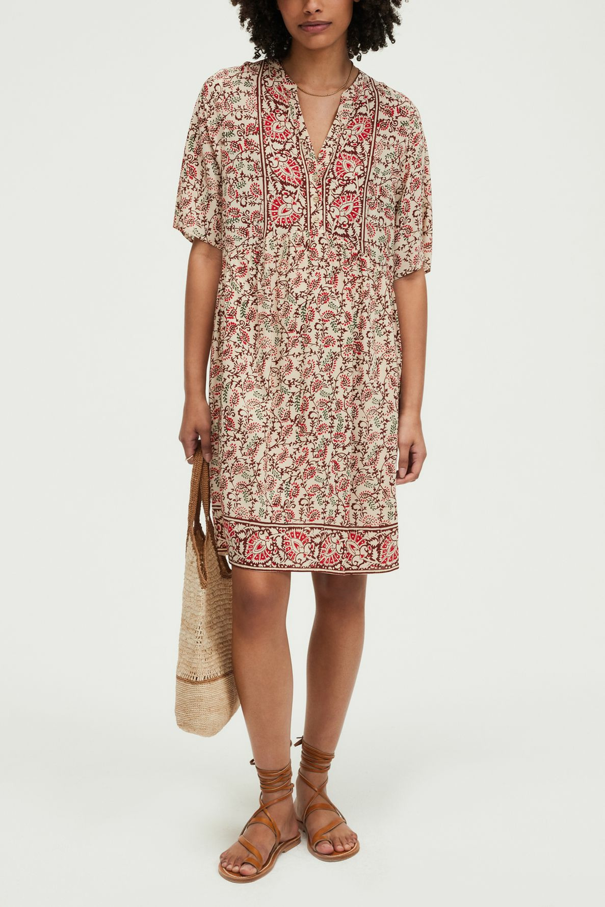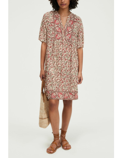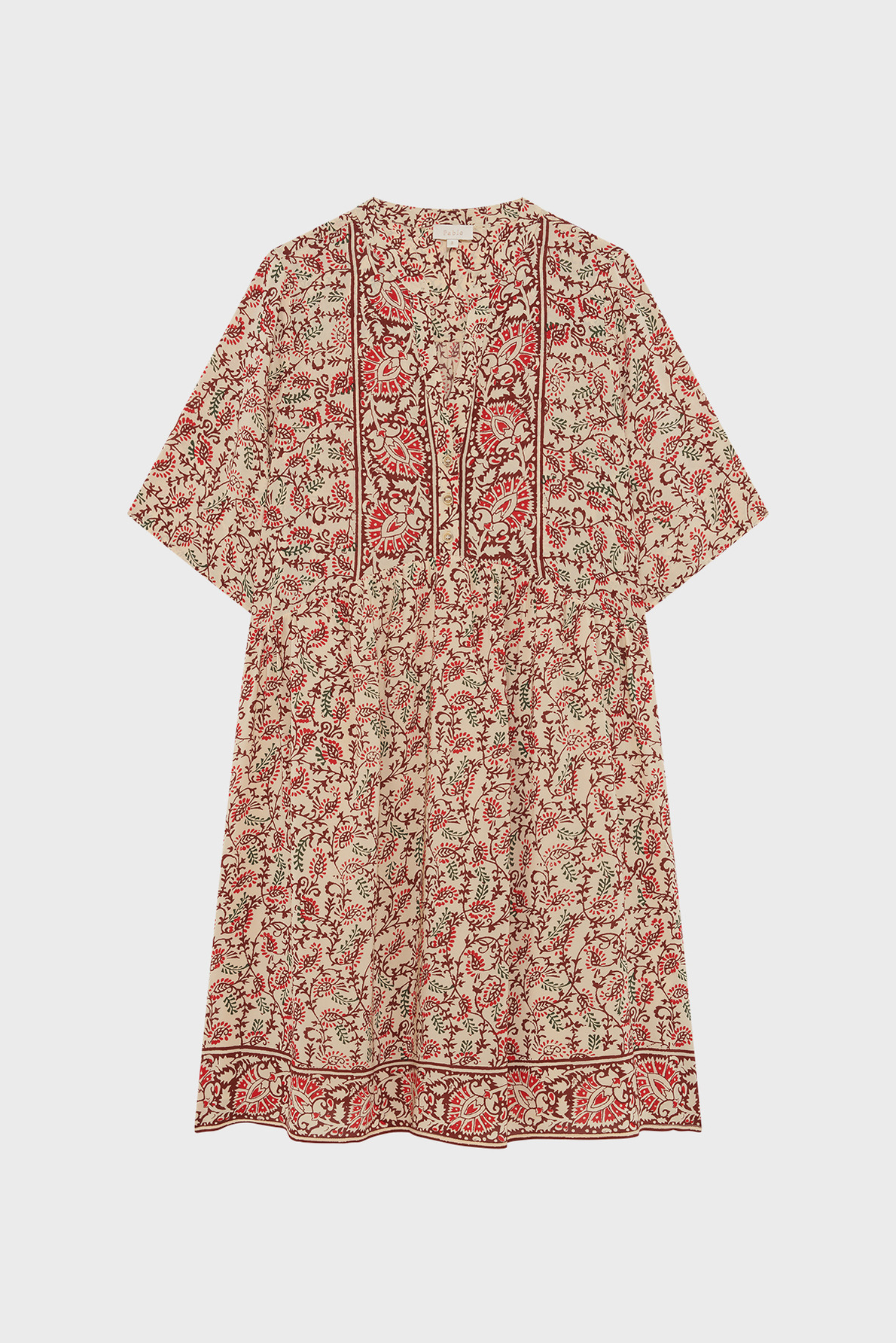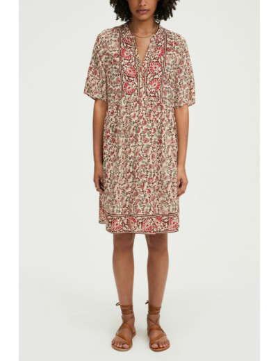Robe courte à coupe droite et large. Motif cachemire imprimé sur une matière légère au toucher soyeux. Col rond esprit tunisien fermé par trois petits boutons ronds. Manches courtes. Empiècement en pointe sous la poitrine avec petits plis.