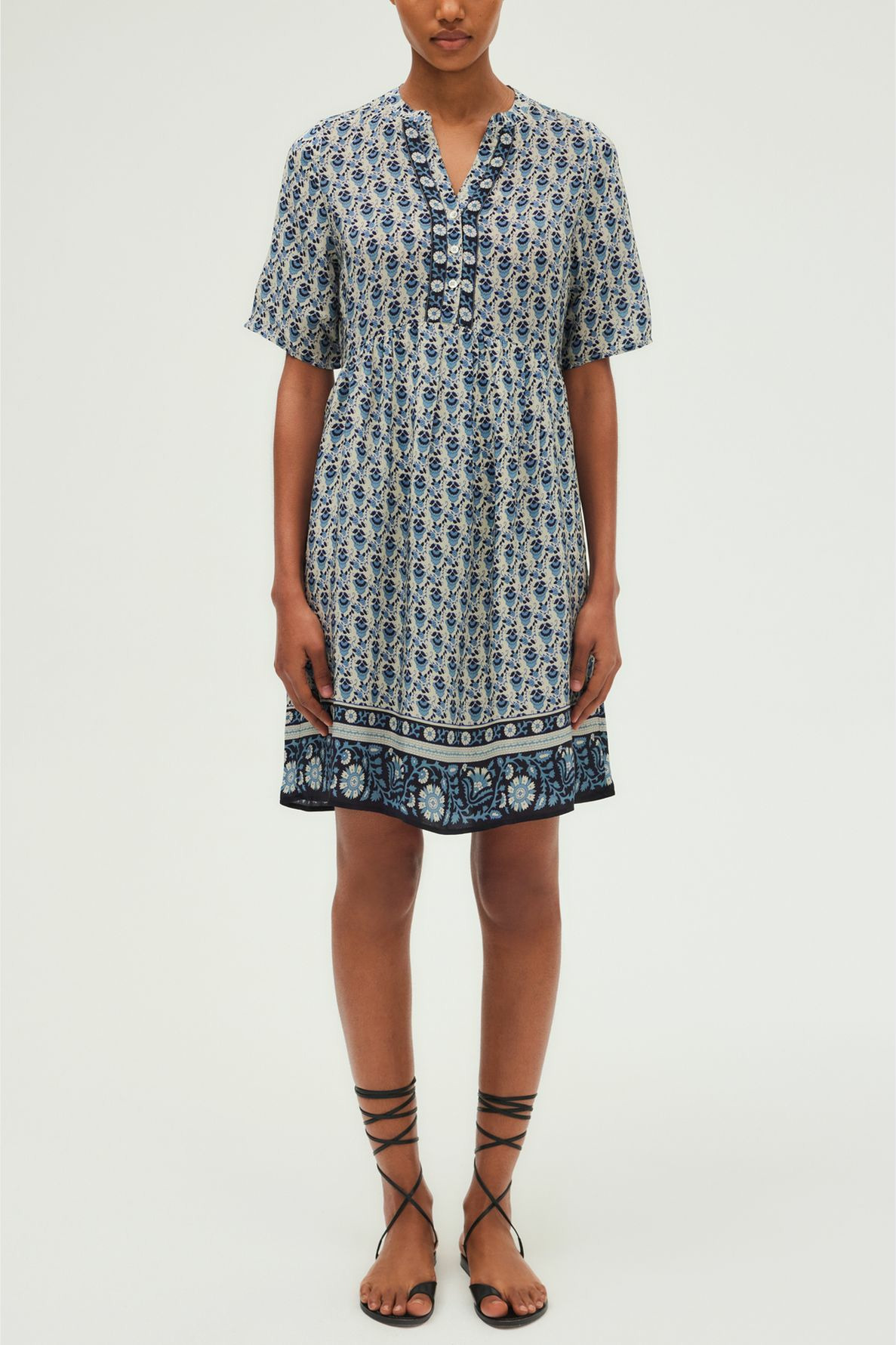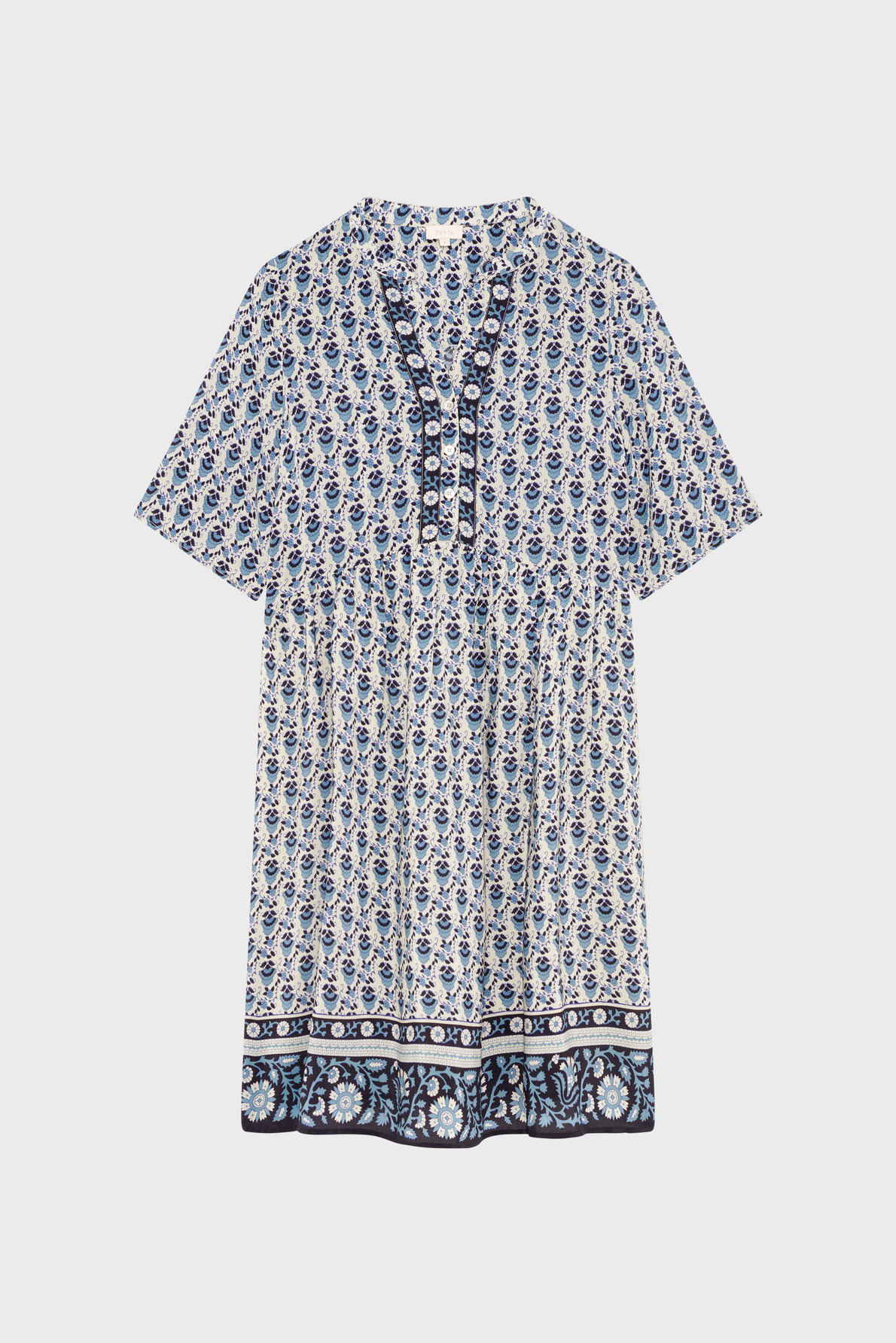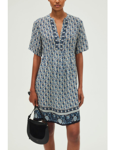 Forme droite et large, robe courte, col rond esprit tunisien, manches courtes, encolure fermée par trois petits boutons ronds, empiècement en pointe sous la poitrine avec petits plis, matière légère au toucher soyeux.