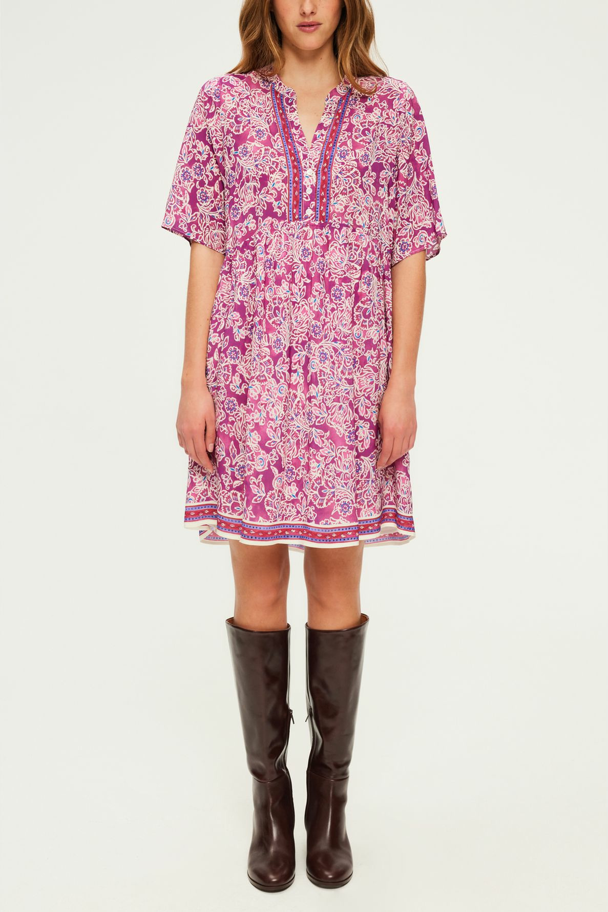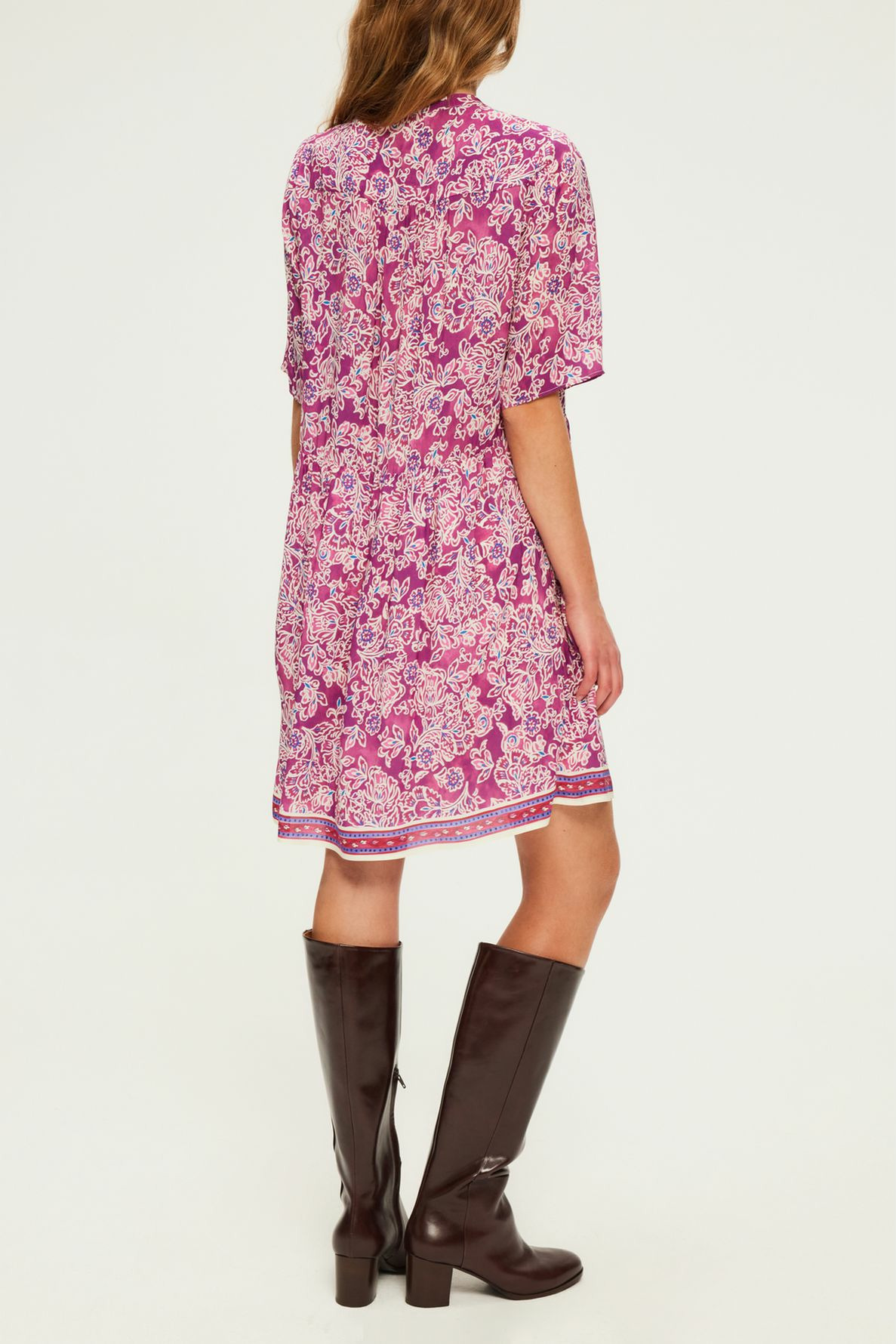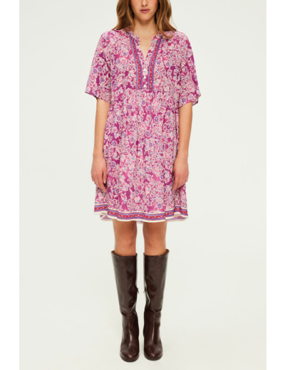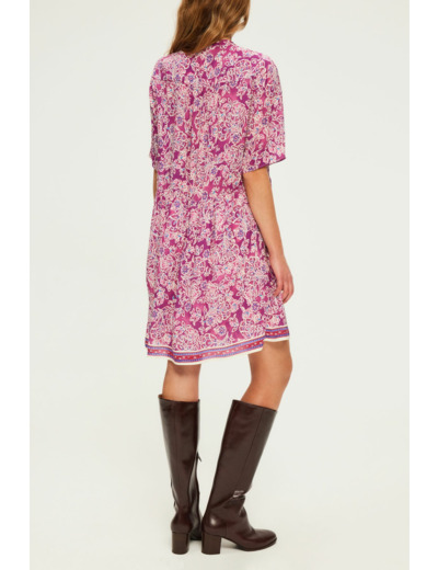 Matière fluide au toucher soyeux. Forme droite. Motif floral. Robe courte. Col tunisien. Manches courtes. Décolleté fermé par trois boutons. Taille élastiquée. Plis dans le dos et sur la jupe. Frise à l’encolure et dans le bas de la jupe. La mannequin mesure 174 cm et porte une taille 2.