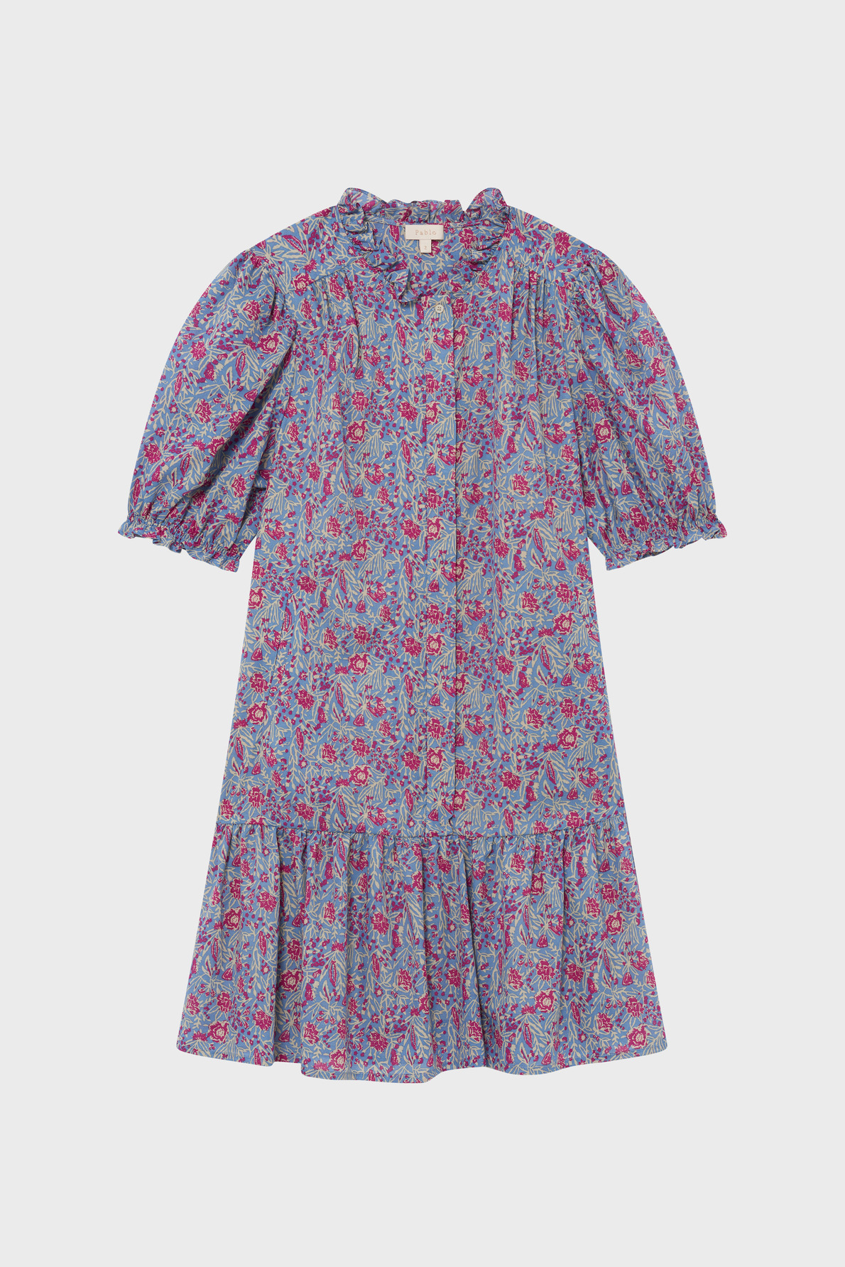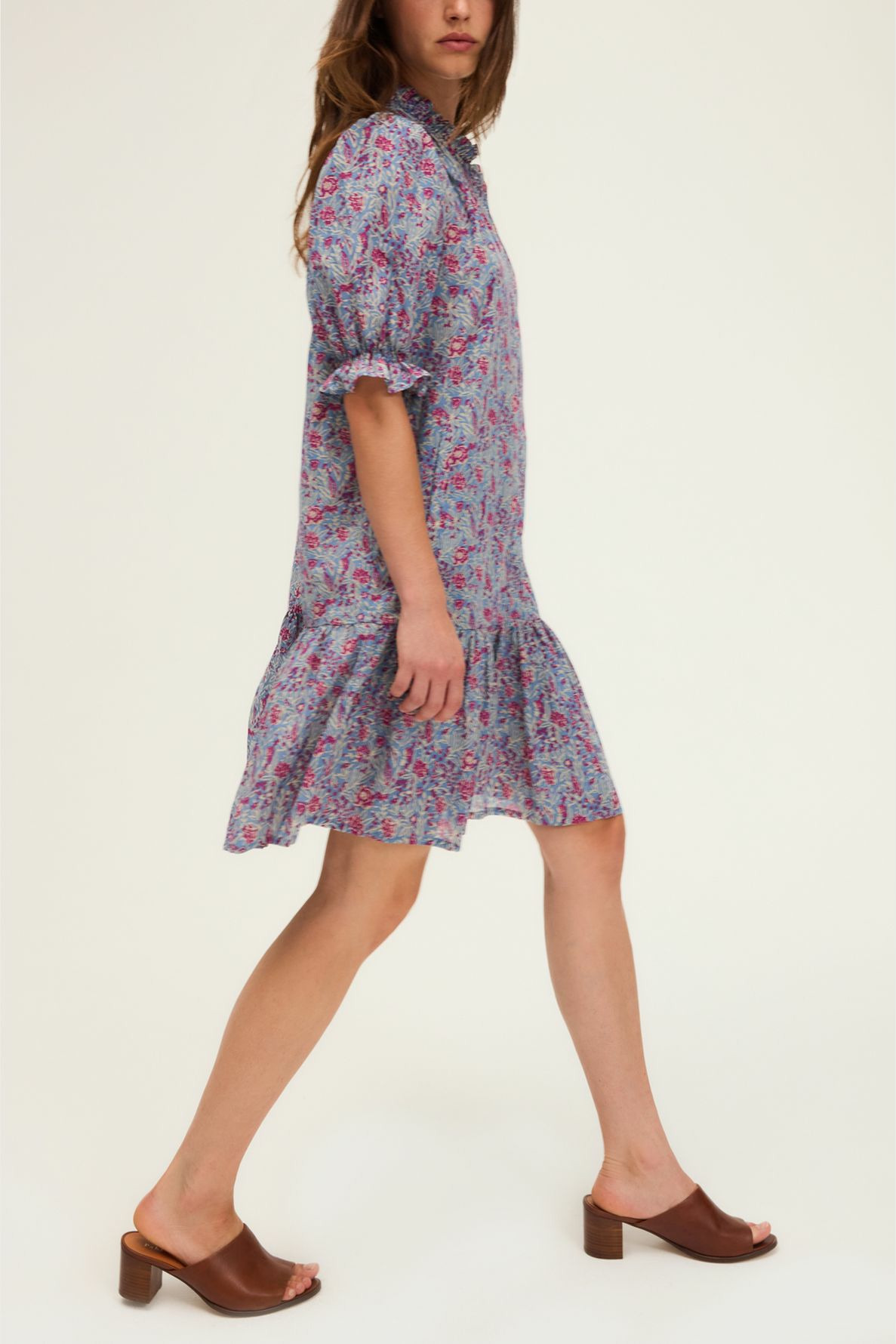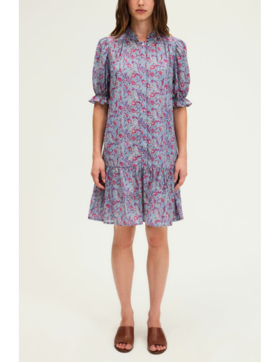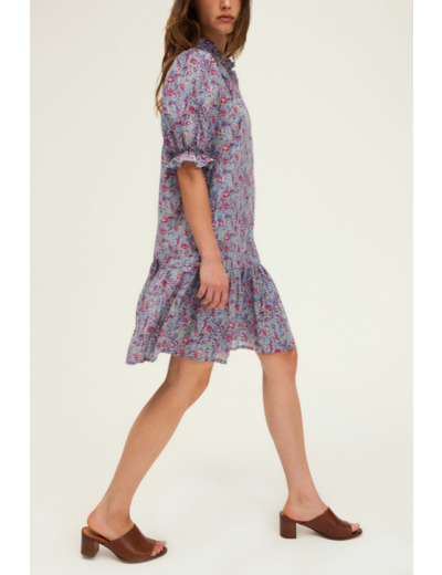 La robe Pimia incarne l’élégance naturelle avec son imprimé floral mauve sur fond bleu et ses détails délicats. Une pièce qui allie féminité et confort pour sublimer votre silhouette en toute saison.
