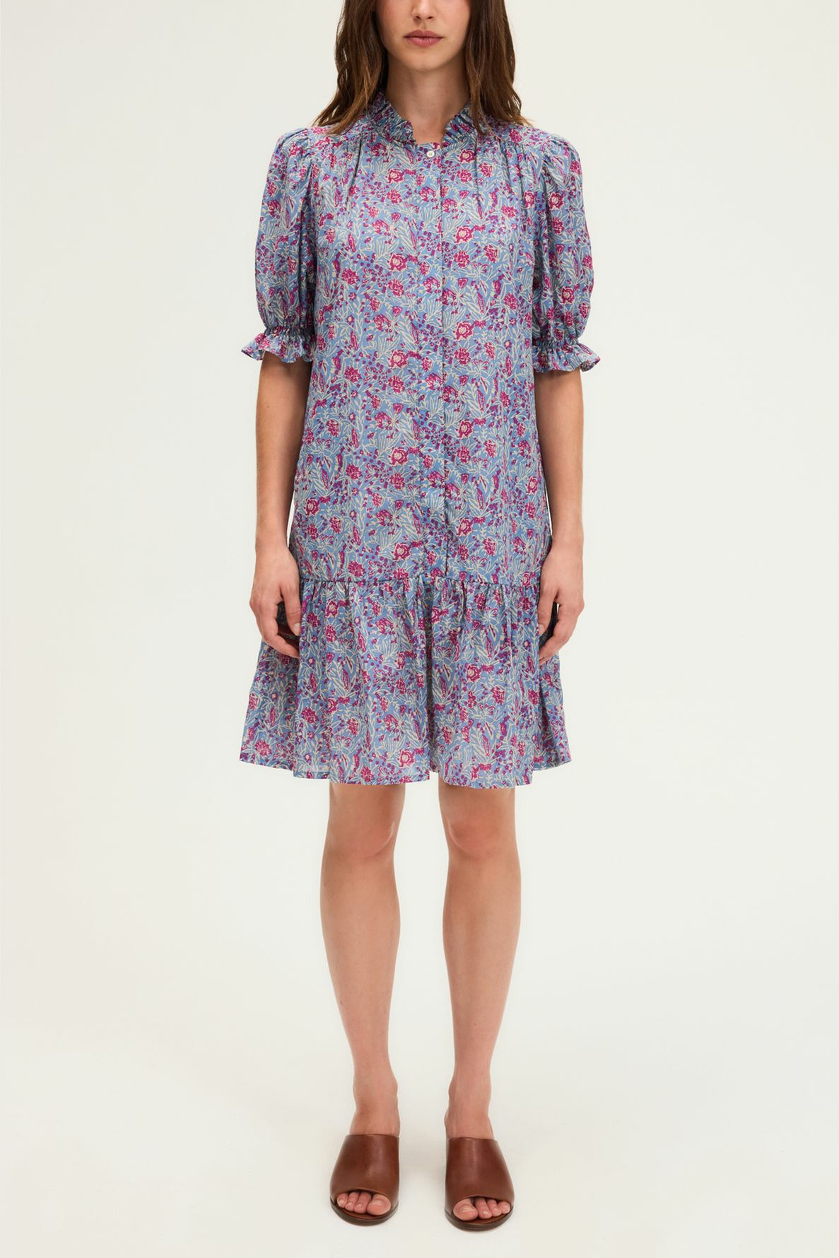 Fabriquée en coton, doublée en mousseline, la robe présente un col montant à volants, un boutonnage sous patte sur presque toute la longueur, des manches courtes avec bas élastiqués volantés, des poches passepoilées en biais, des plis aux épaules et en haut du dos, ainsi qu’un bas de jupe volanté. Sa forme droite et large s’évase délicatement vers le bas.