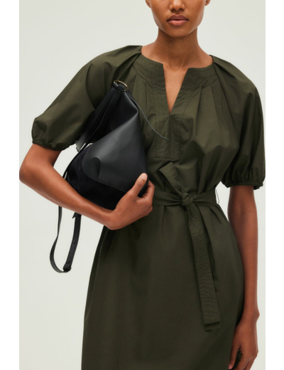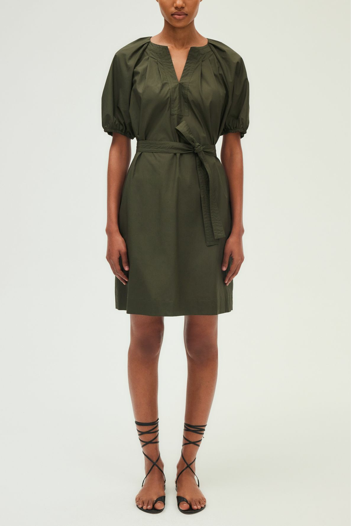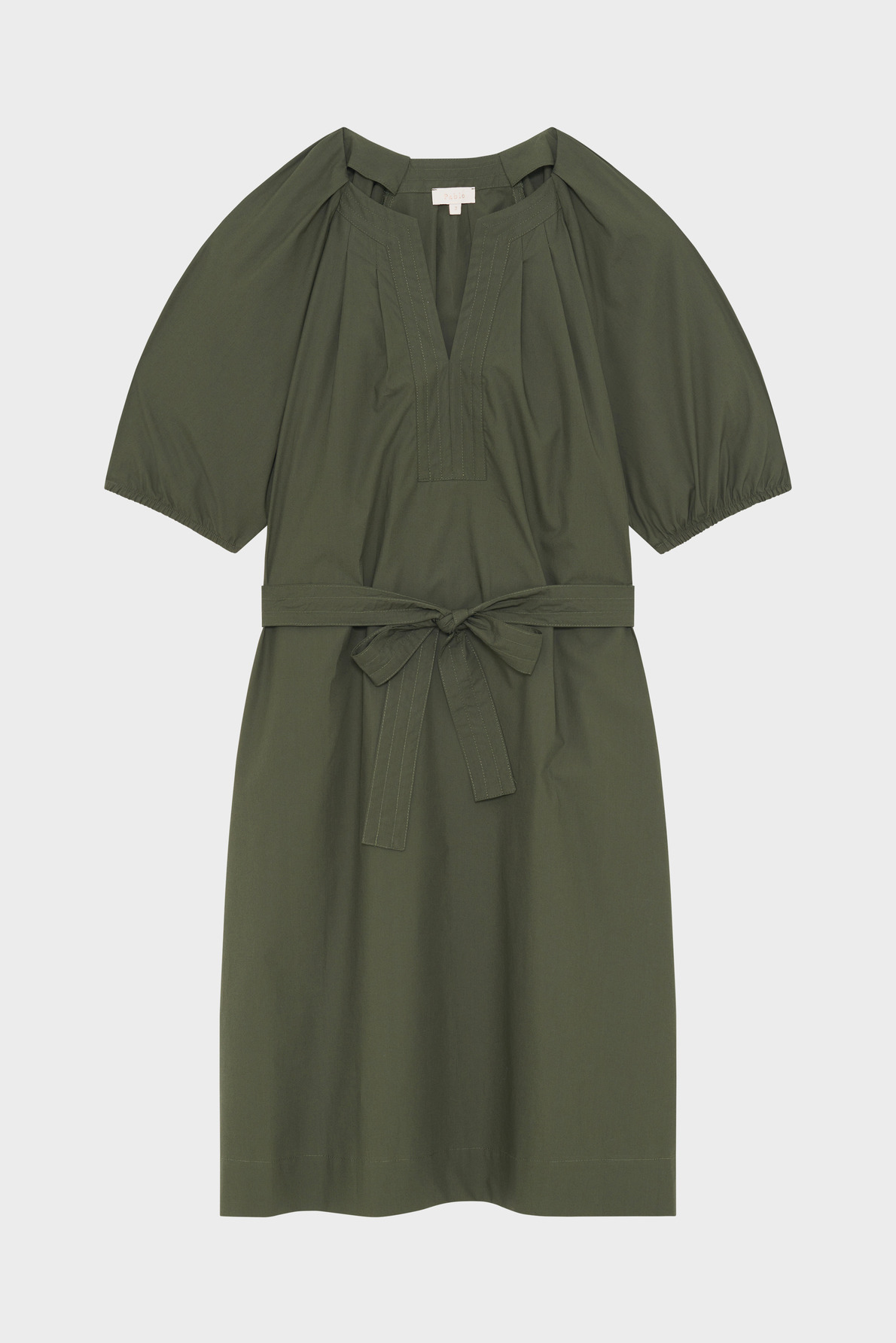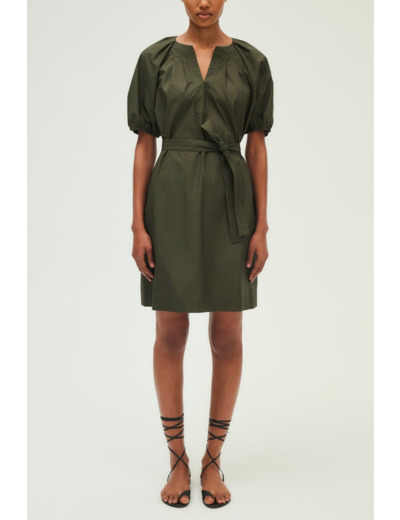 Robe courte en coton uni kaki profond. Forme droite et large. Emmanchure raglan. Col rond esprit tunisien avec empiècement et surpiqûre ton sur ton à l’encolure. Manches courtes avec bas élastiqués. Poches insérées dans la couture. Plis plats sur le devant et en haut du dos.