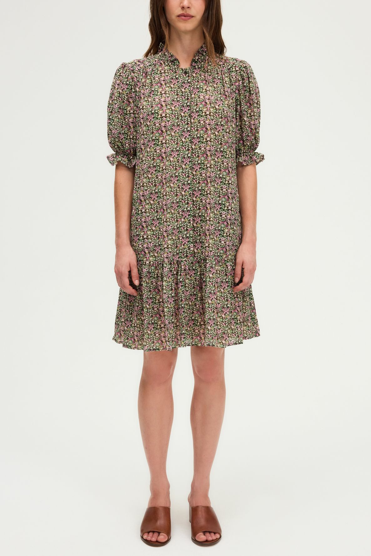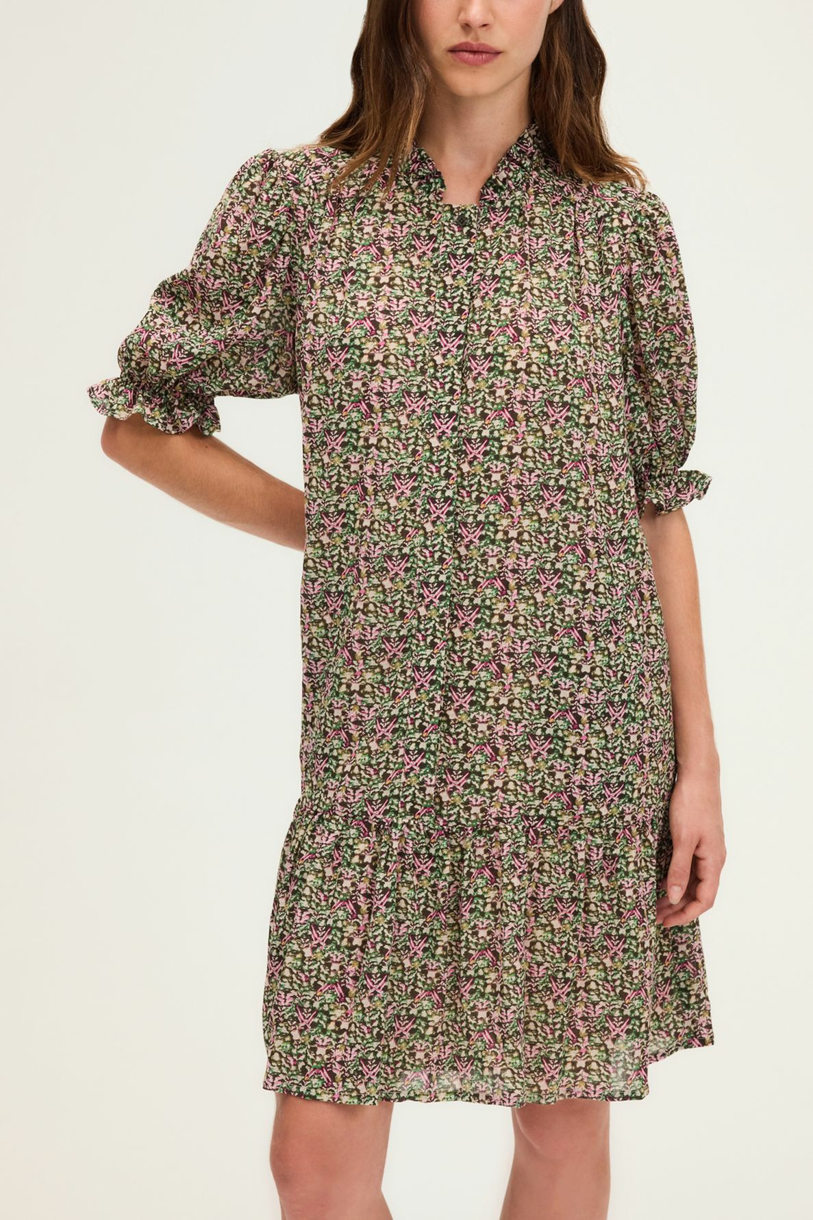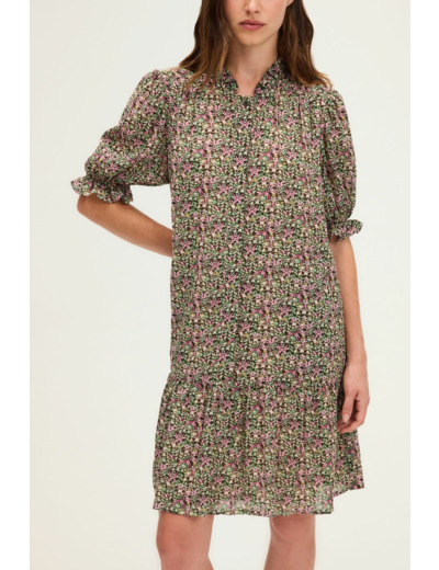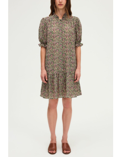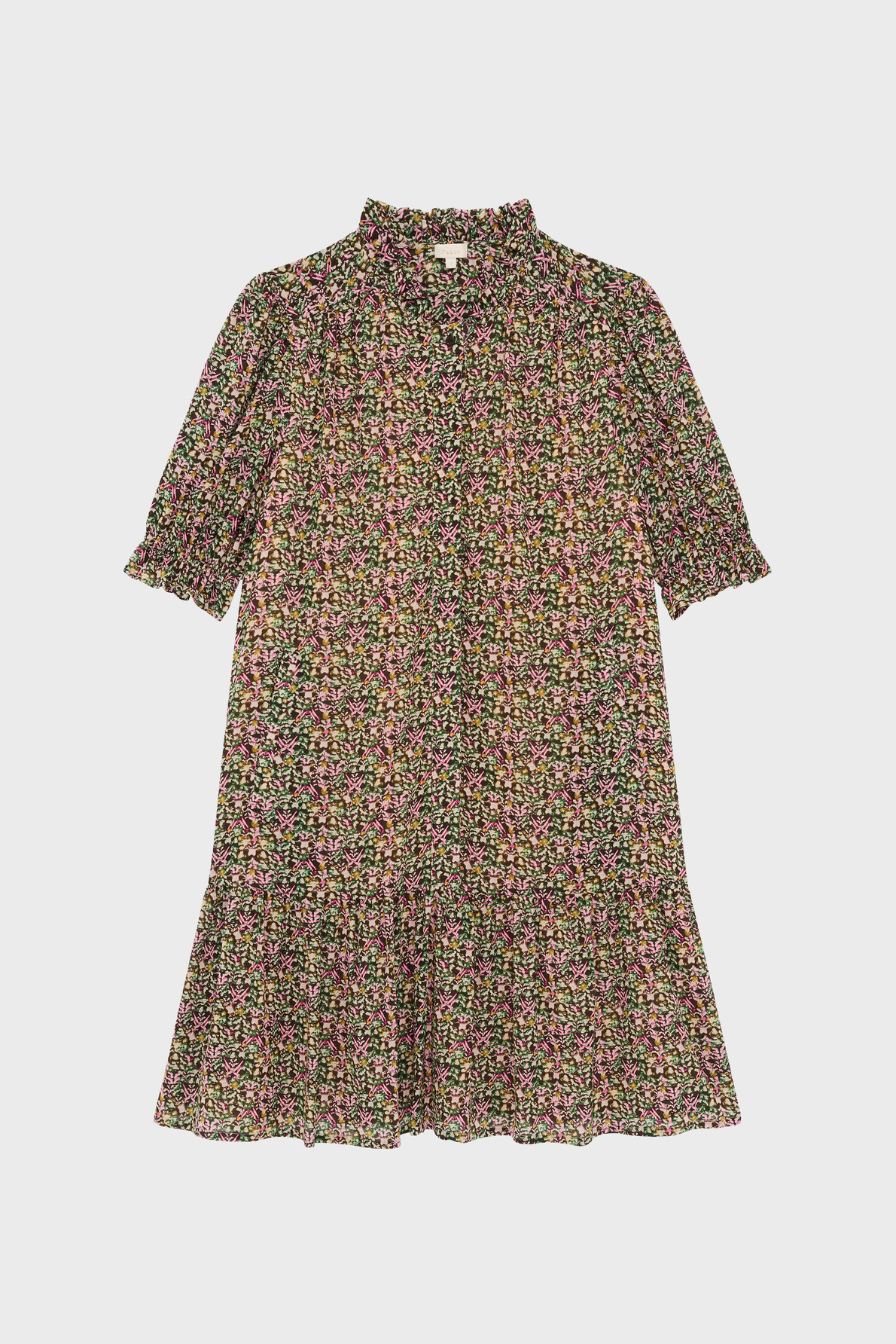 Forme droite et large, évasée dans le bas. Motif ethnique kaki et fuchsia. Robe courte doublée. Col montant à volants. Manches courtes avec bas élastiqué volanté. Boutonnage sous patte sur presque toute la longueur. Poches passepoilées en biais. Plis aux épaules et en haut du dos. Bas de jupe volanté.