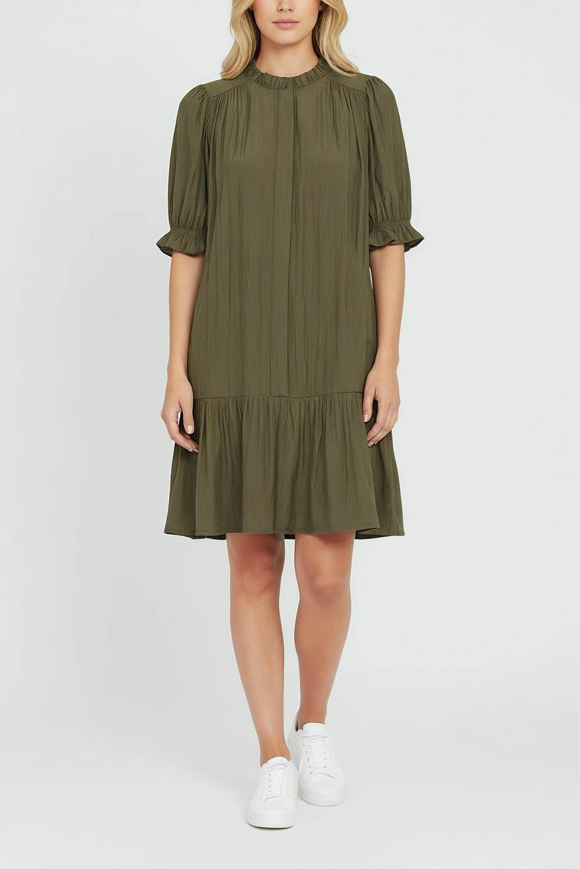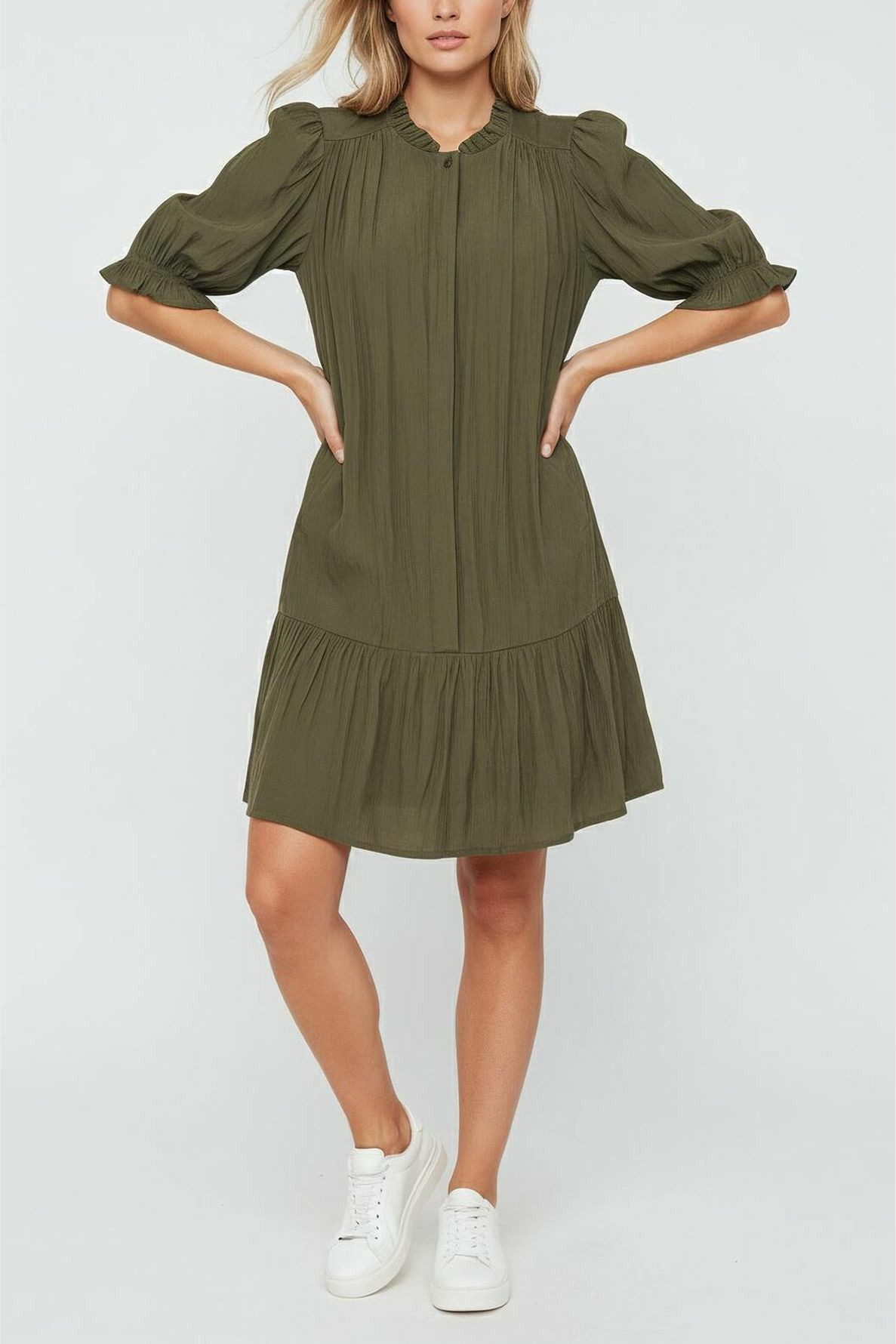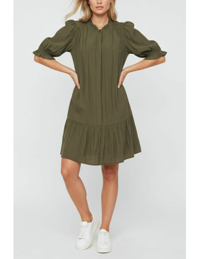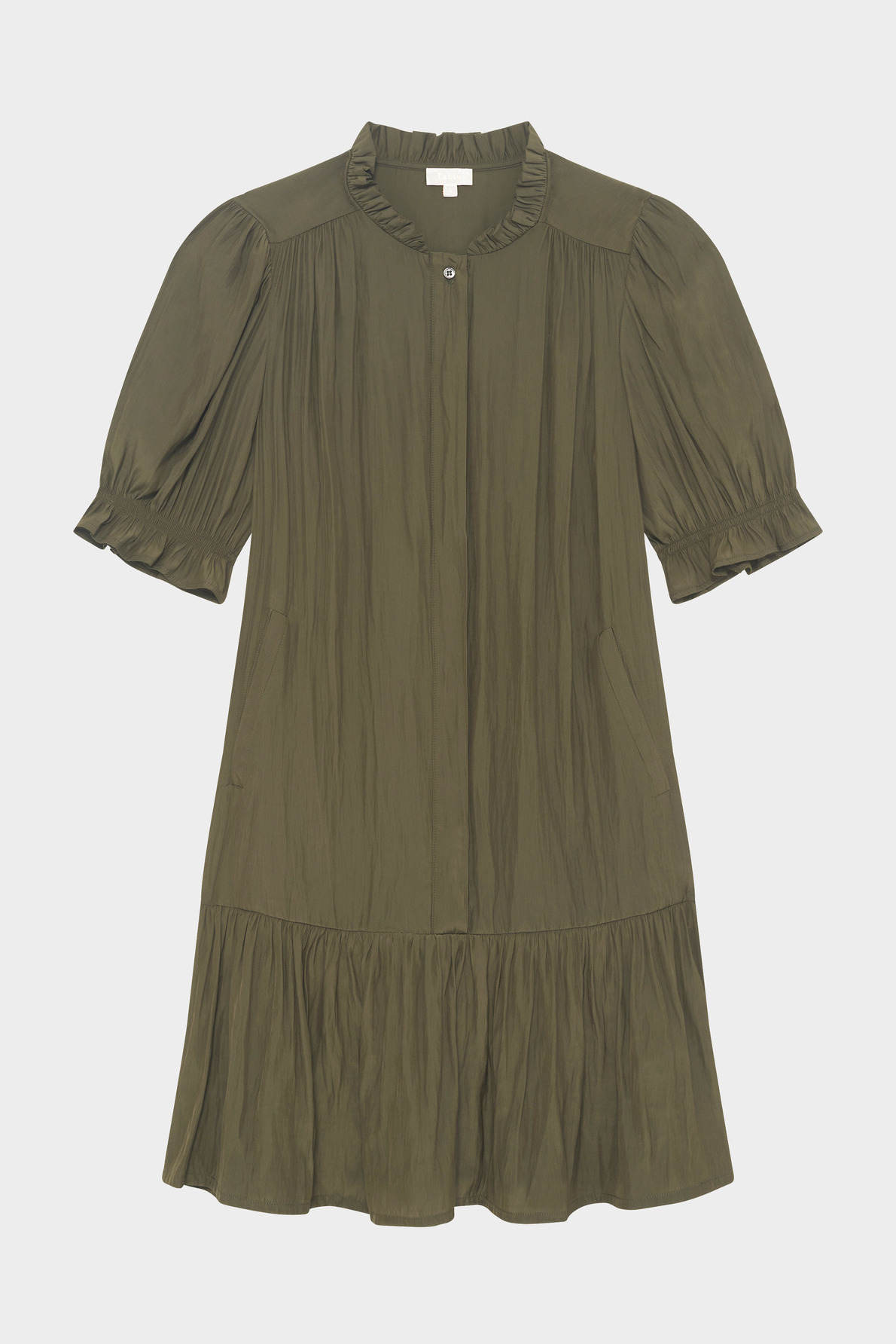 Robe courte en satin uni, légèrement plissée. Boutonnage sous patte sur presque toute la longueur. Col montant à volants. Manches courtes avec bas élastiqué et volanté. Poches passepoilées en biais. Plis sous les épaules et en haut du dos. Bas de jupe volanté. Forme droite, large et évasée.
