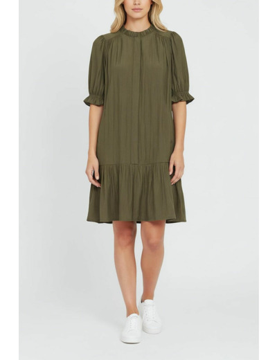 Conçue dans une matière satinée légèrement plissée, cette robe Pablo séduit par son col montant à volants et ses manches courtes au bas élastiqué et volanté. Boutonnée sur presque toute la longueur, elle dévoile un jeu de plis subtils sous les épaules et en haut du dos, qui apporte une touche de sophistication. Le bas de jupe volanté accentue l’effet évasé pour une silhouette féminine et aérienne.