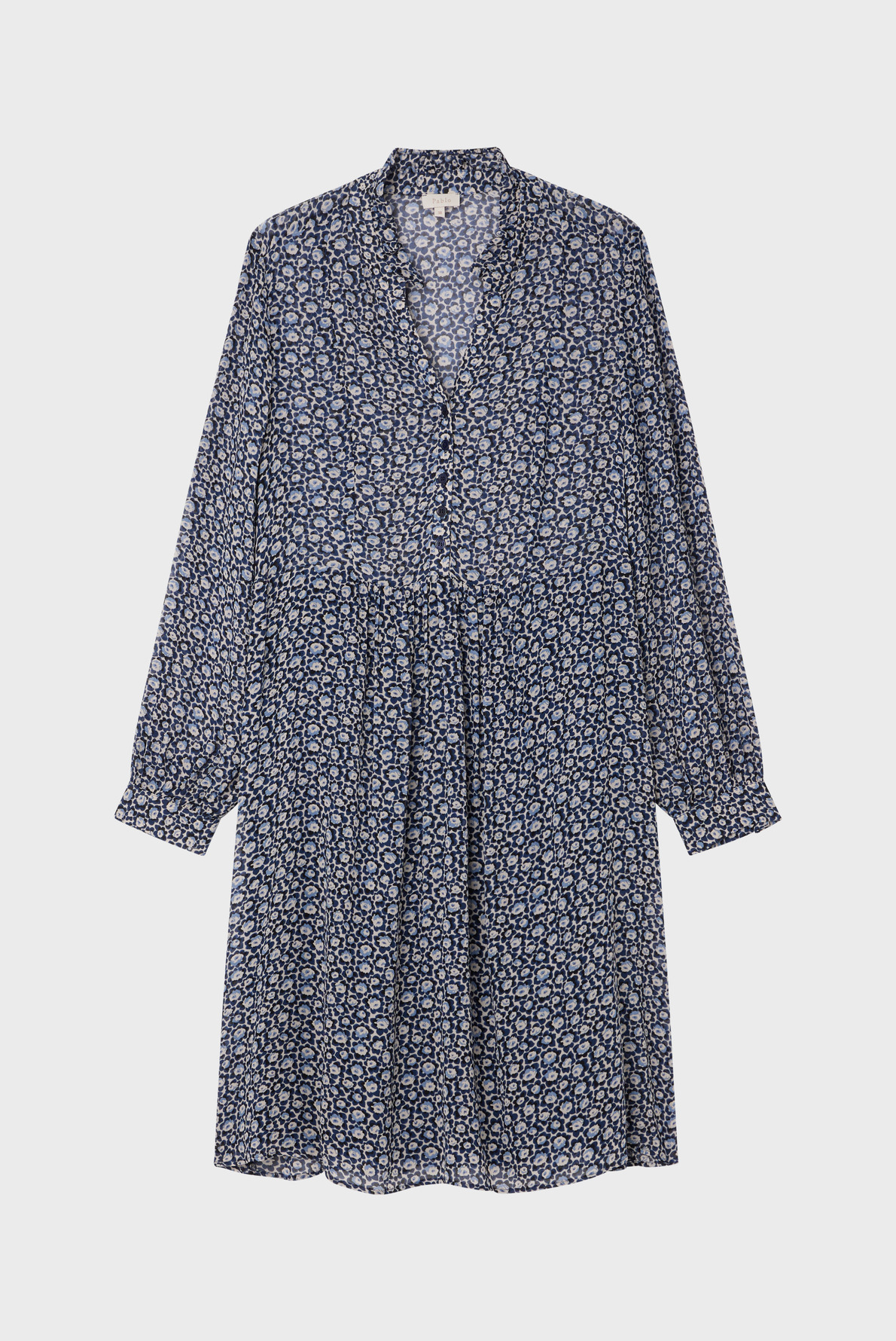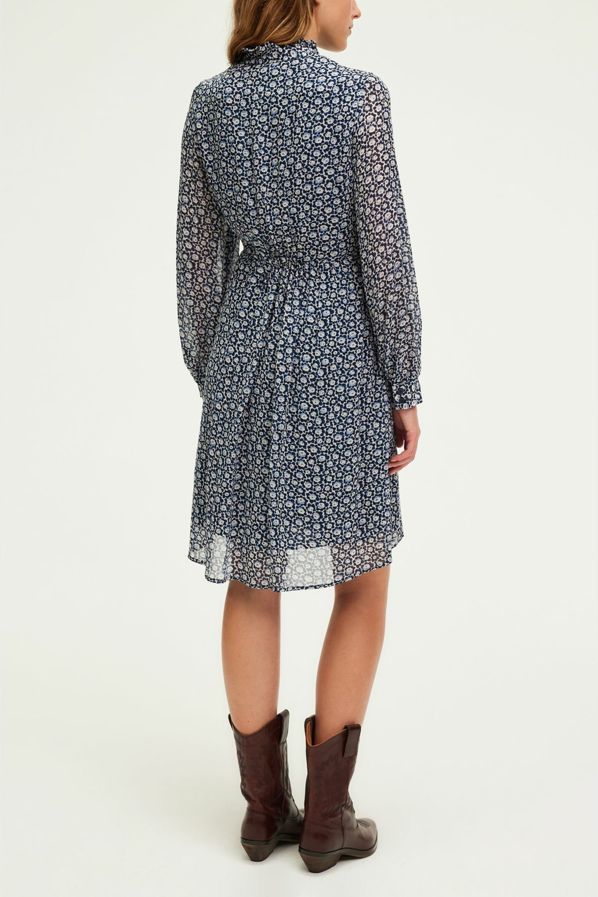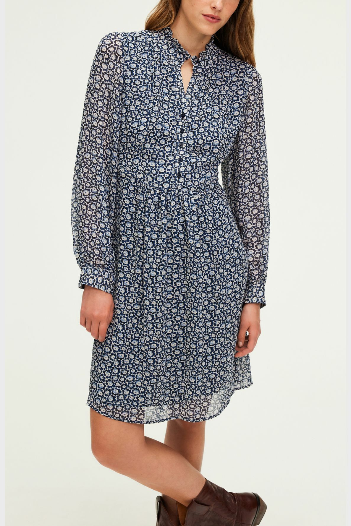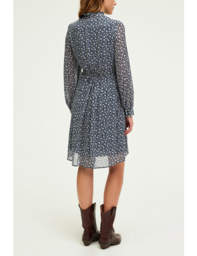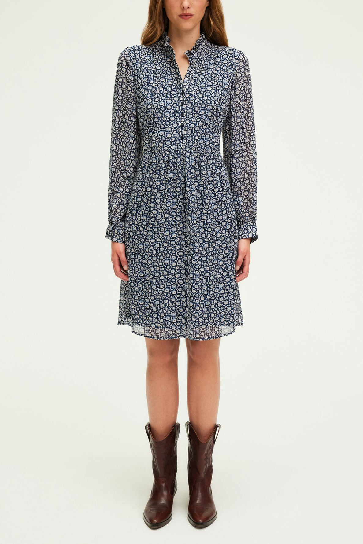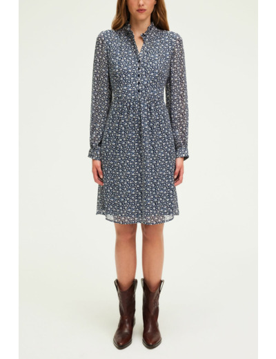 Robe courte en crêpe, forme droite, motif floral bicolore. Col montant à volants, manches longues avec poignets fermés par deux boutons ronds. Encolure fermée par boutons ronds. Dos élastiqué pour un confort optimal. Poches insérées dans la couture. La mannequin mesure 174 cm et porte une taille 2.