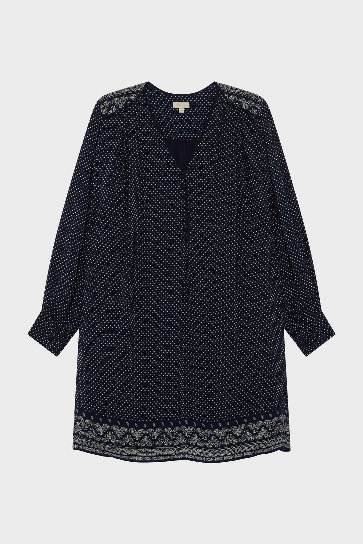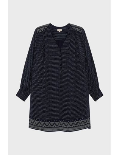 Forme droite et large, robe courte, col V, manches longues avec poignets boutonnés, épaules renforcées par épaulettes, poches insérées dans la couture. Matière fluide au toucher soyeux. La mannequin mesure 174 cm et porte une taille 2.