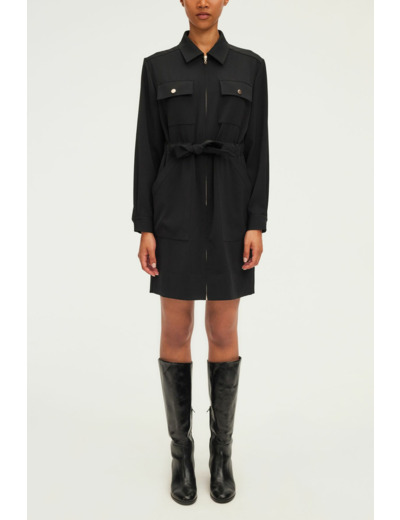 Quels sont les détails qui rendent cette robe élégante ? Le zip doré, les boutons dorés aux poignets et poches, ainsi que le col chemise apportent une finition soignée.