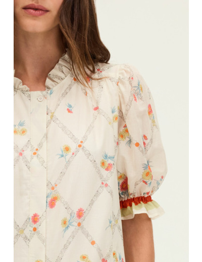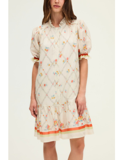 Légère et élégante, cette robe en voile de coton invite à la fraîcheur et au style sans effort. Son motif floral éclatant sur fond blanc apporte une touche de fraîcheur printanière à votre garde-robe.