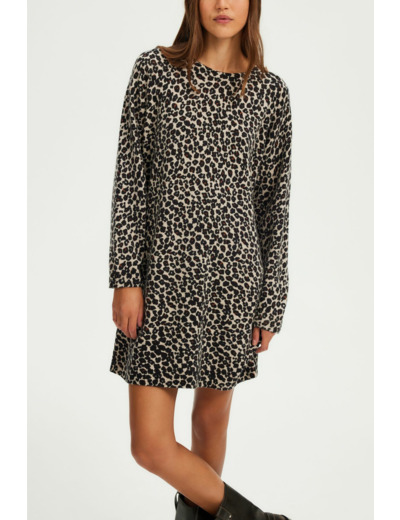 Robe courte à motif léopard, 100% laine stretch. Forme droite, col rond, manches longues. Finitions bord-côtes pour un maintien parfait. La mannequin mesure 174 cm et porte une taille 1.