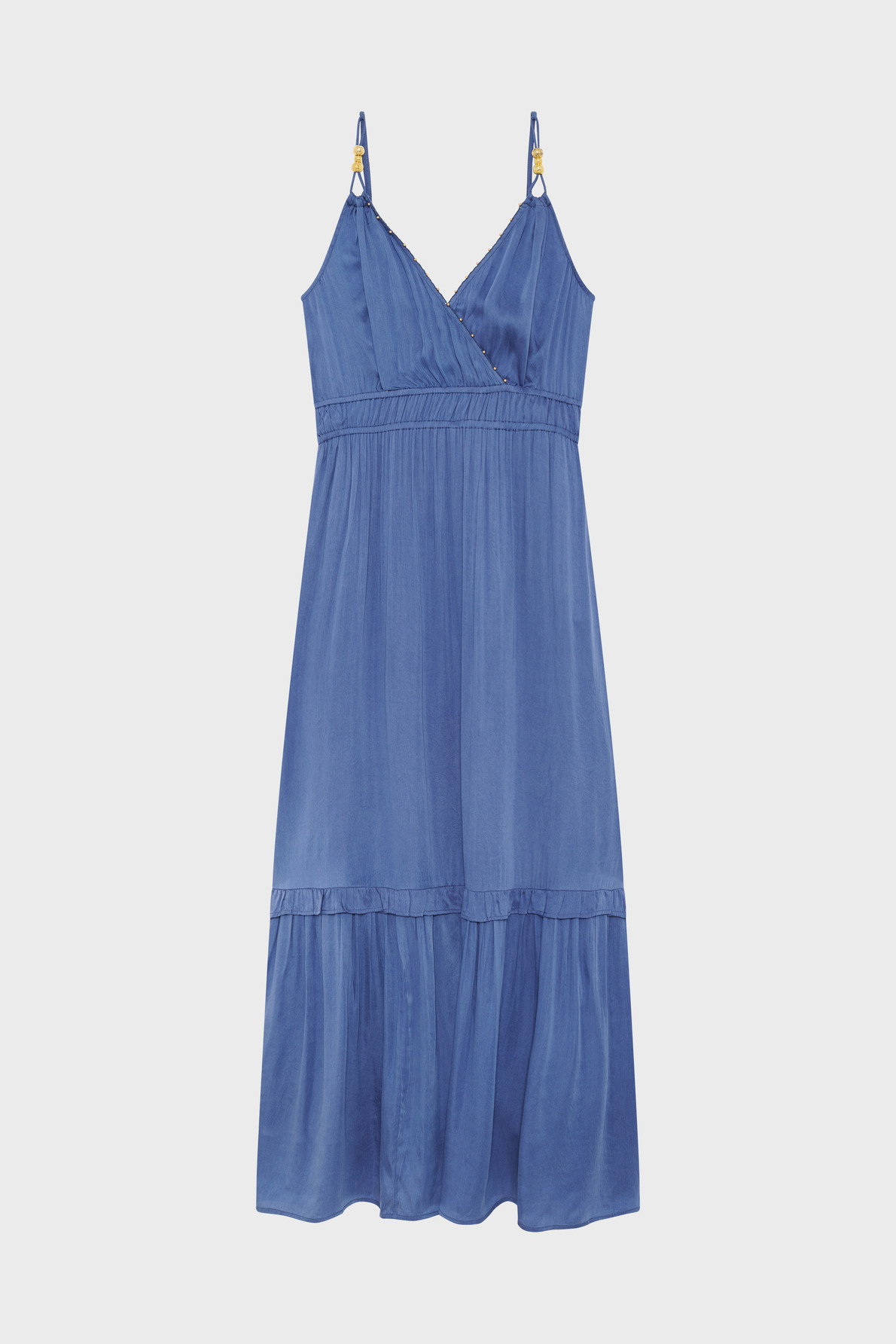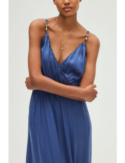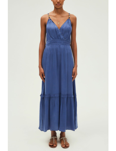 Robe longue en cupro, tissu uni bleu profond. Col V esprit cache-cœur avec petites boules décoratives. Sans manches, fines bretelles. Taille élastiquée pour un ajustement parfait. Jupe à étage volanté, forme cintrée et évasée en bas. Matière éco-responsable issue d’une fibre végétale de coton.