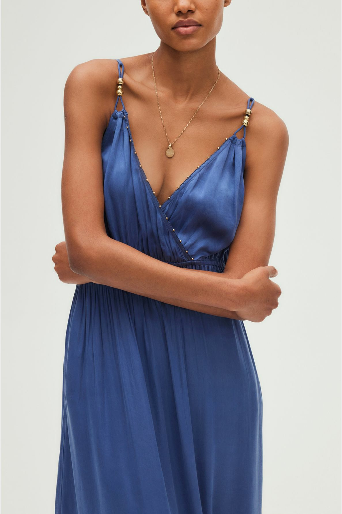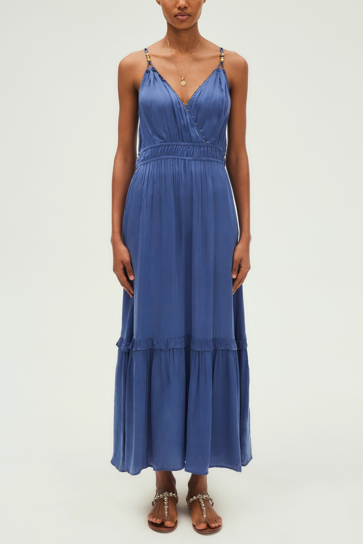 Sublimez votre silhouette avec cette robe longue Pablo, alliant élégance et légèreté. Son décolleté cache-cœur orné de petites boules apporte une touche délicate et originale à votre tenue.