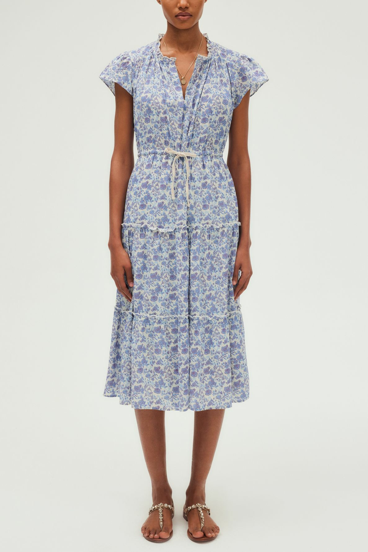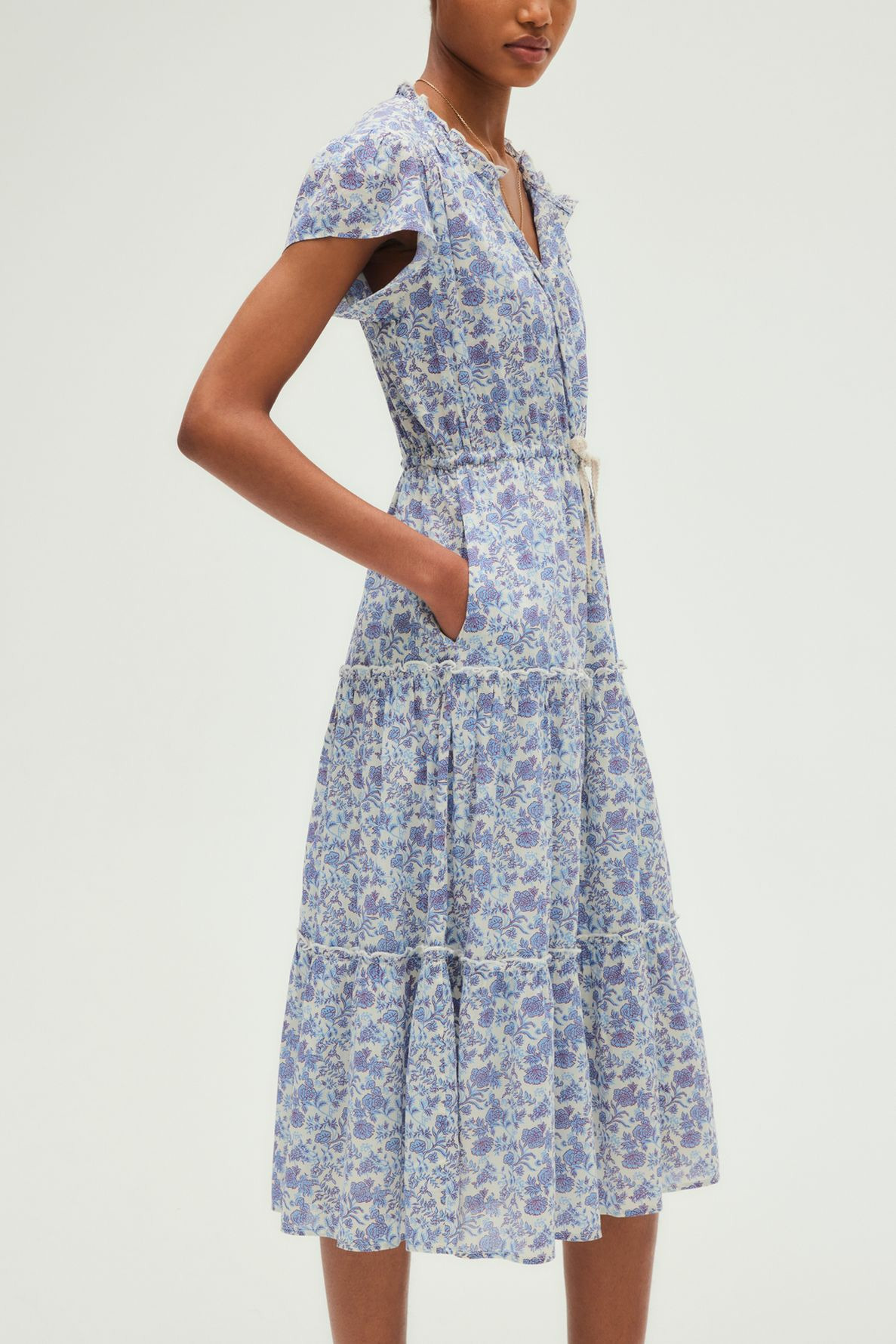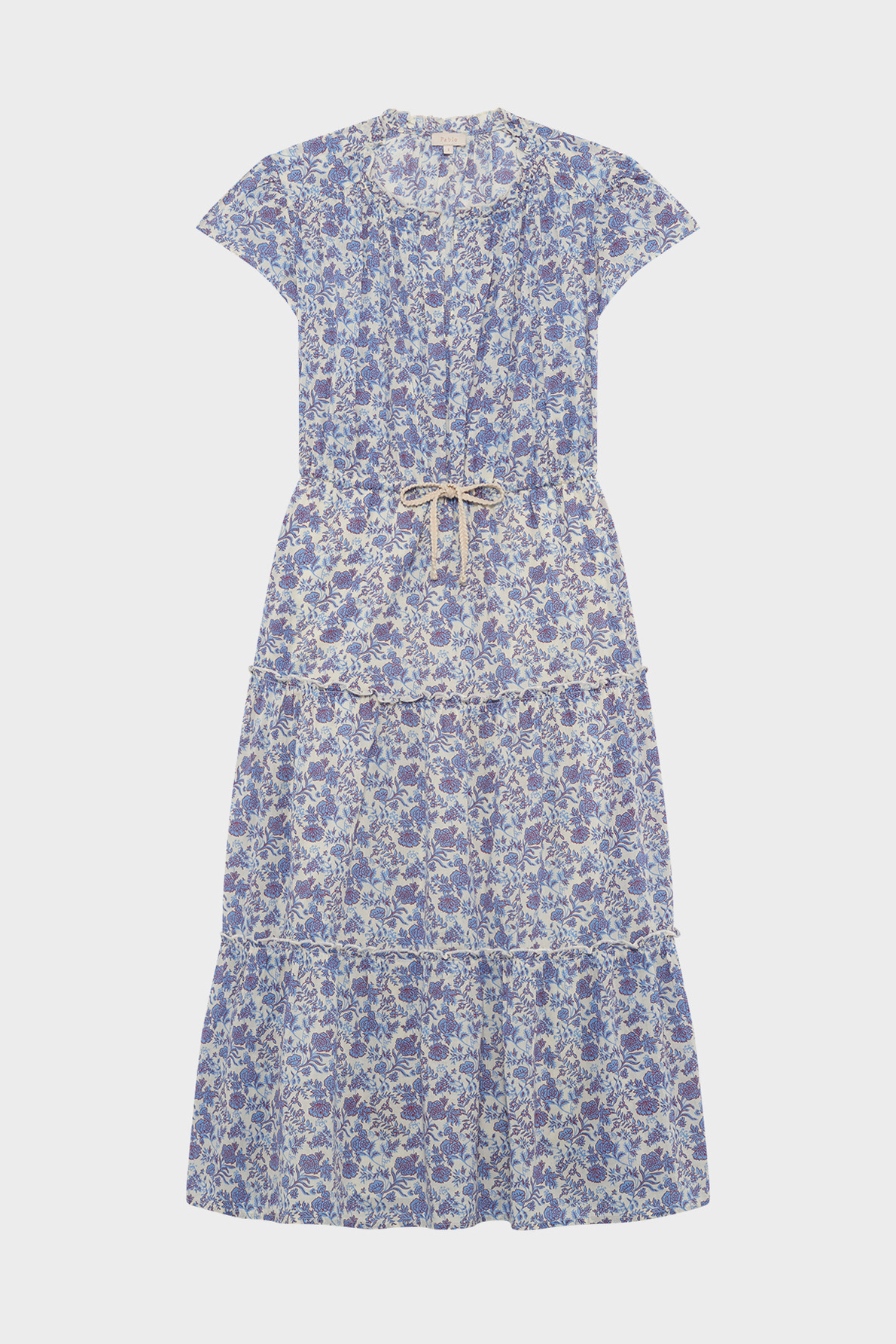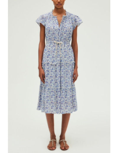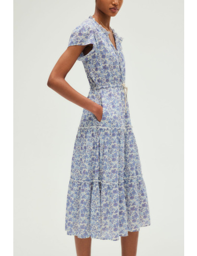 Robe longue en 100% coton. Forme cintrée avec taille élastiquée et lien de serrage. Motif floral romantique. Col rond avec volants. Manches courtes. Jupe à étages volantés.