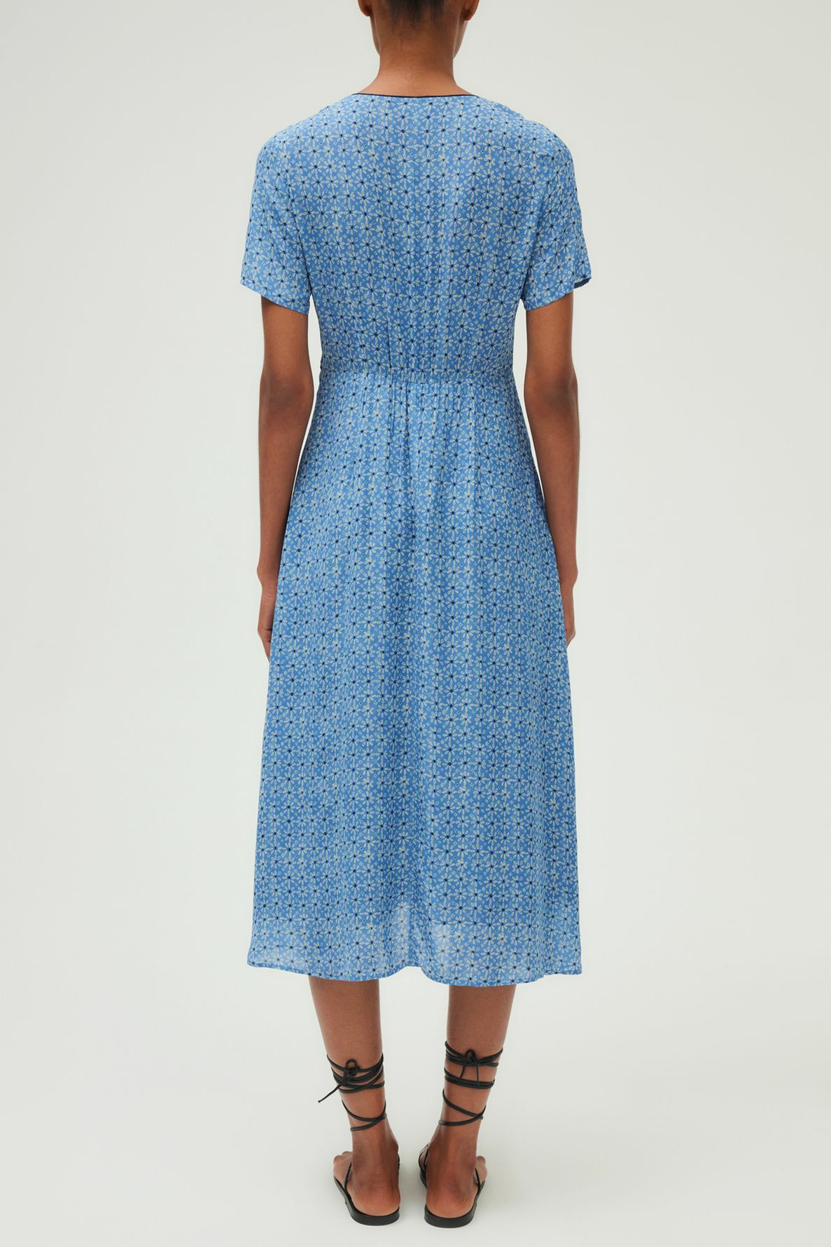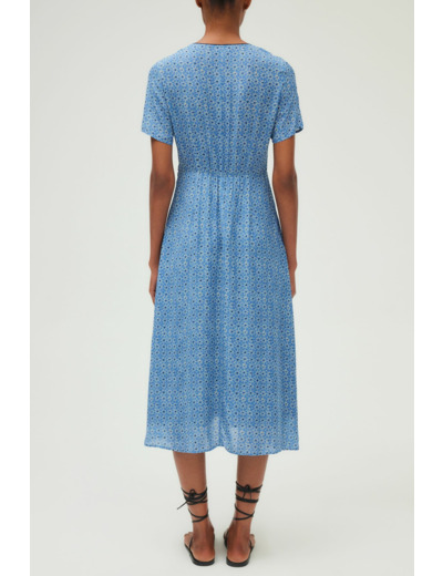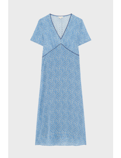 Robe longue fluide avec motif floral, forme cintrée à la taille et évasée en bas. Col V décolleté, manches courtes tulipes. Fermeture latérale zippée invisible. Dos élastiqué pour plus de confort. Découpe en pointe sous la poitrine. Ganse bleu marine pour souligner le décolleté et la taille.