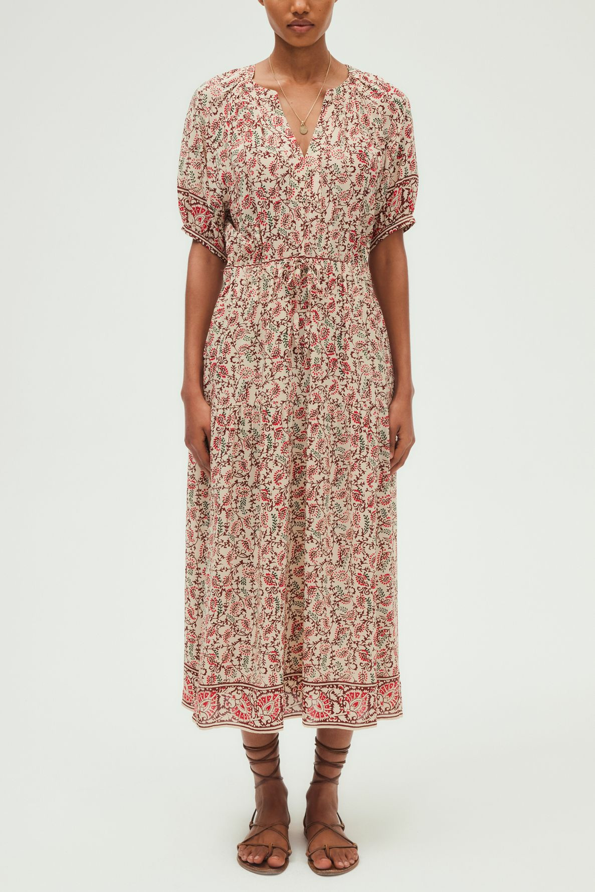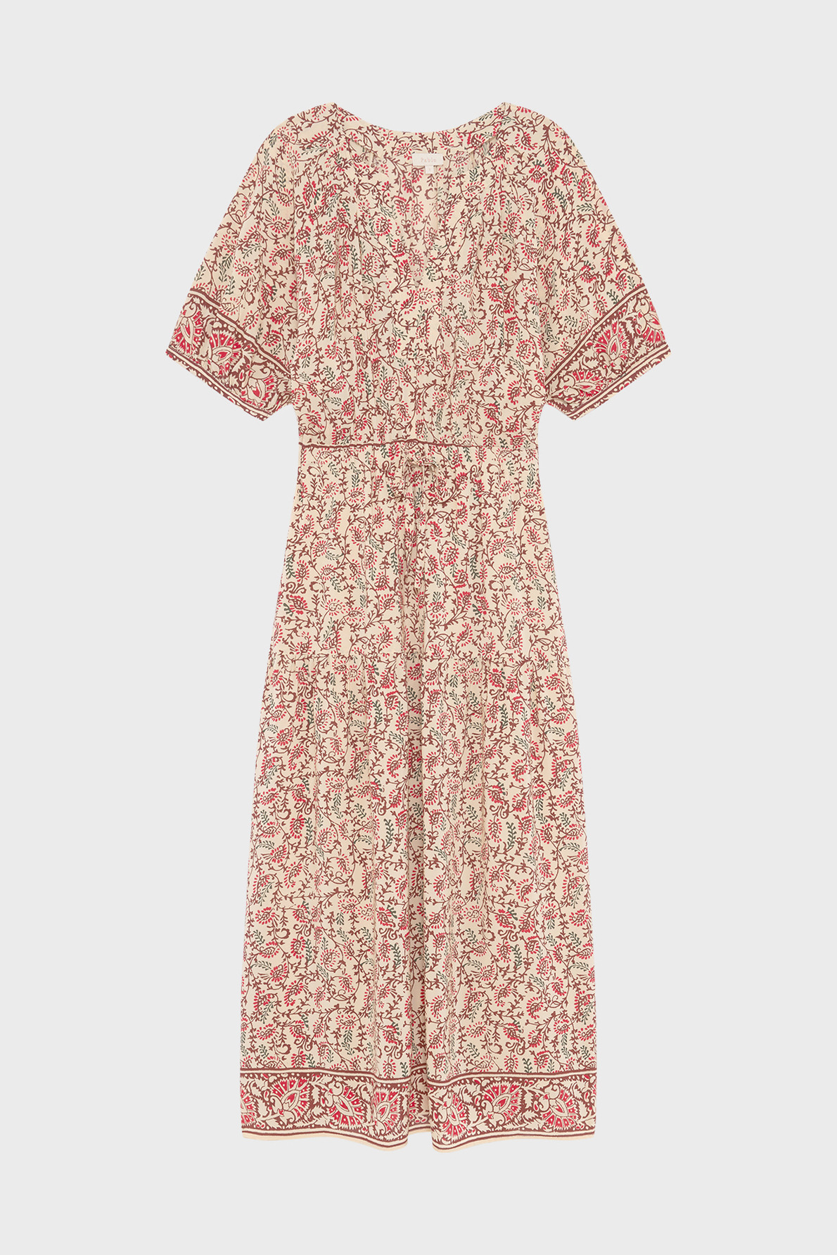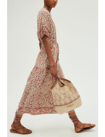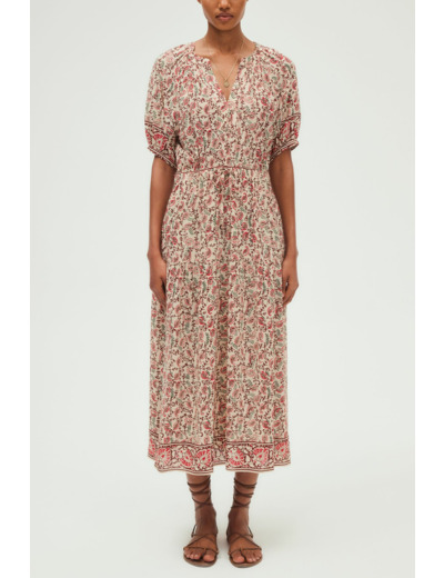 Robe longue cintrée à imprimé végétal, col rond tunisien, manches courtes avec bas élastiqués. Taille élastiquée avec lien de serrage, poches insérées dans les coutures. Matière fluide plissée, jupe à étage volanté pour un volume élégant.