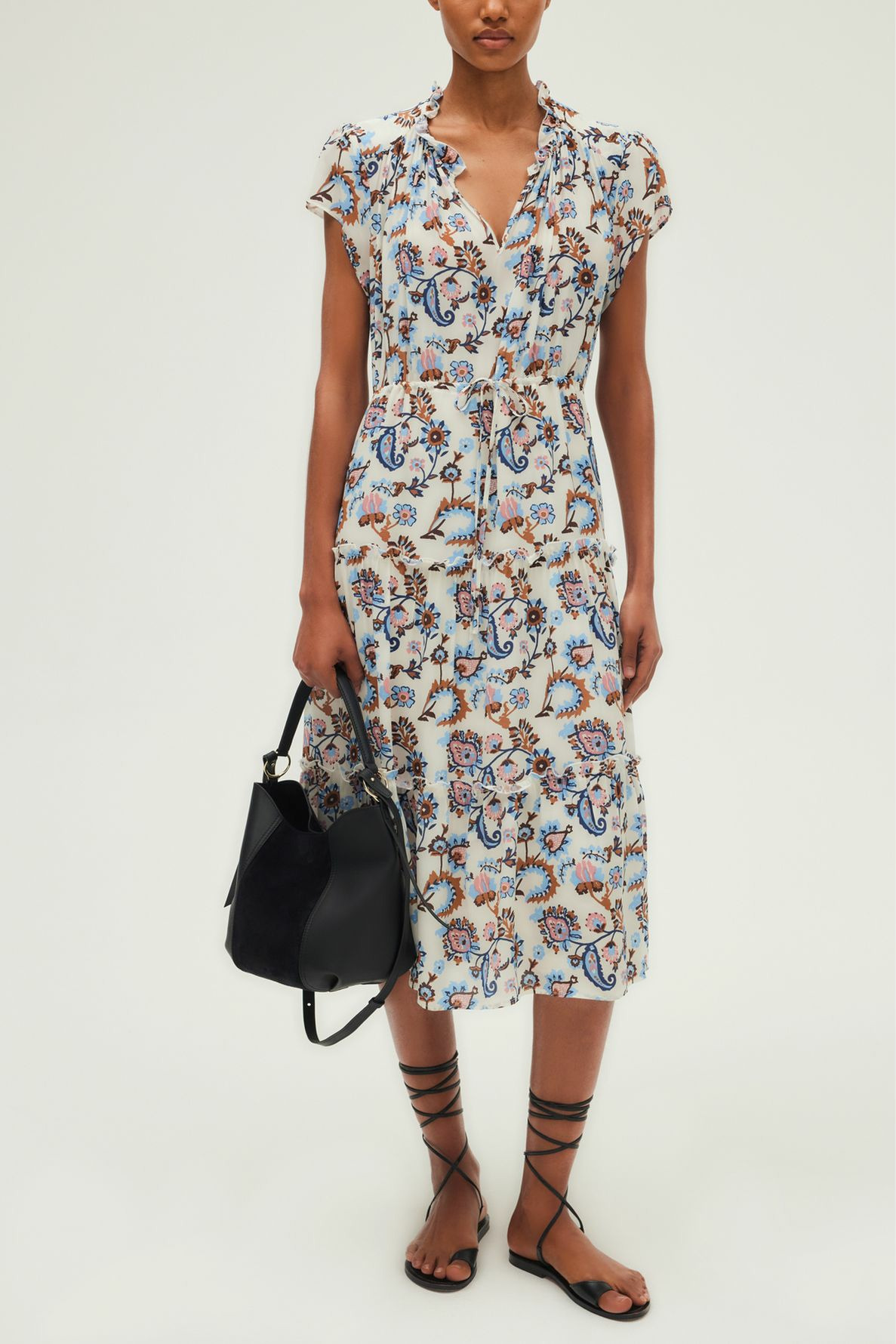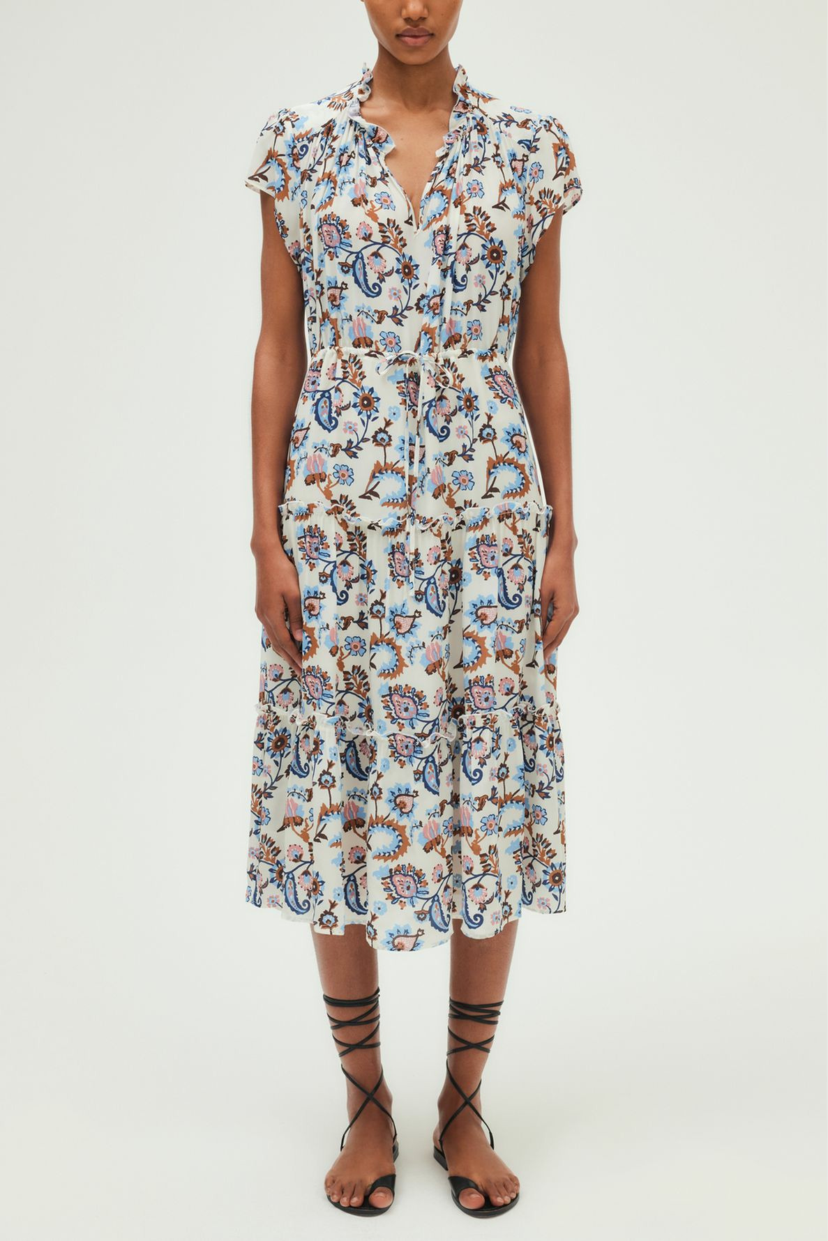 Conçue dans une matière soyeuse au toucher délicat, cette robe Pablo épouse le corps grâce à sa taille élastiquée et son lien de serrage, offrant une silhouette cintrée et équilibrée. Le col rond agrémenté de volants et la jupe à étages volantés apportent une touche de légèreté et de mouvement, tandis que les manches courtes complètent ce modèle intemporel.