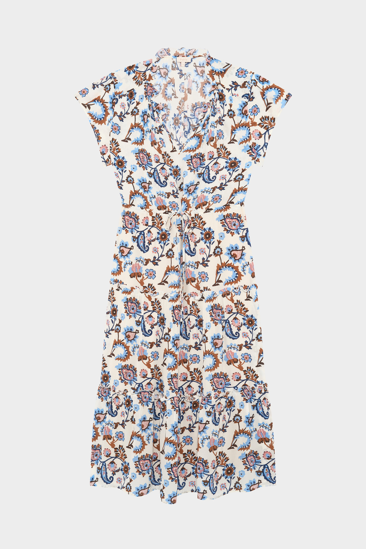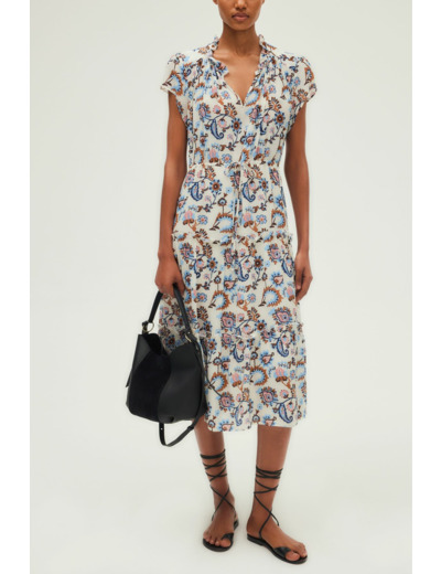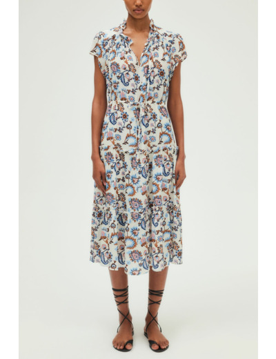 Robe longue avec imprimé grand cachemire esprit vintage. Forme cintrée à la taille grâce à un lien de serrage et taille élastiquée. Col rond orné de volants, manches courtes. Jupe à étages volantés. Matière douce au toucher soyeux.