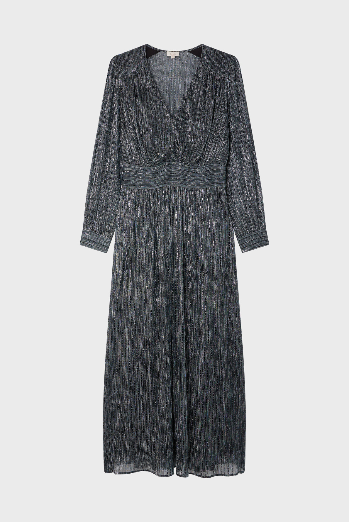 Robe longue en lurex à effet plissé, forme cintrée, col V portefeuille, manches longues transparentes avec boutons ronds aux poignets, dos élastiqué, épaules plissées, empiècement taille, fermeture par bouton pression à l’encolure.