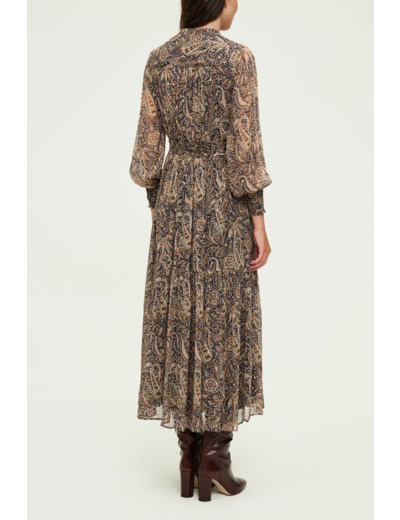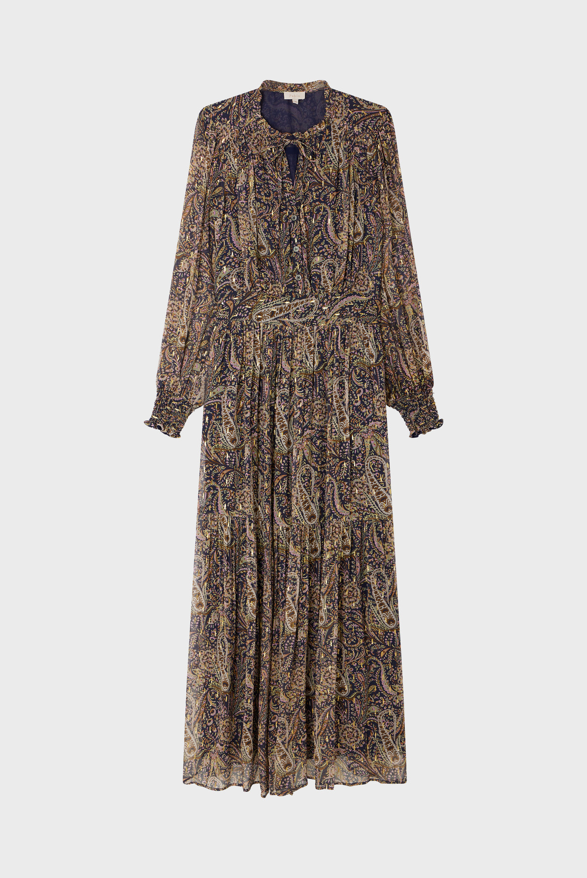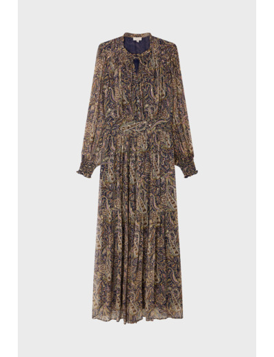 Sublimez votre silhouette avec cette robe longue Pablo au motif cachemire rehaussé de lurex, parfaite pour une allure seventies chic. Son jeu de textures et ses détails raffinés en font une pièce maîtresse de votre garde-robe.