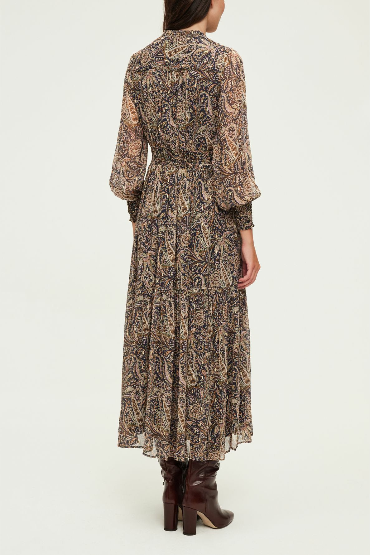 Forme cintrée, motif cachemire avec lurex, robe longue, col montant lacé orné de petits volants, bas de manches élastiqués smockés, fermeture latérale zippée, dos élastiqué, poches insérées dans la couture, encolure fermée par trois petits boutons, jupe à étages volantés, tissu à l’aspect légèrement plissé. La mannequin mesure 180 cm et porte une taille 38.