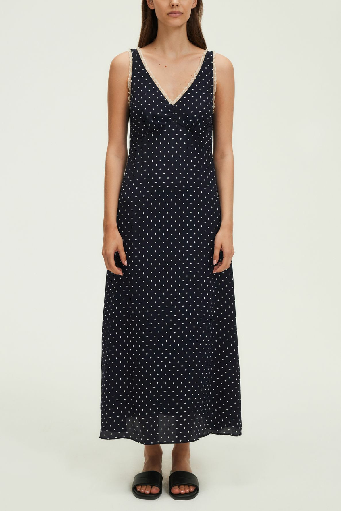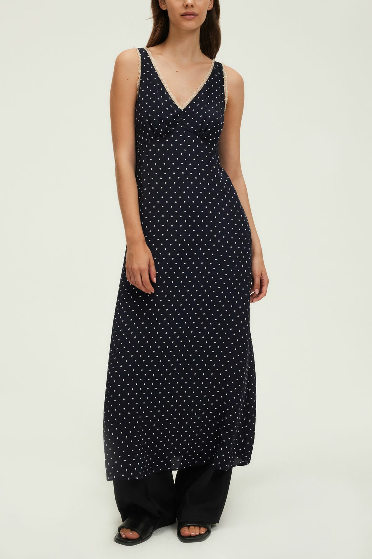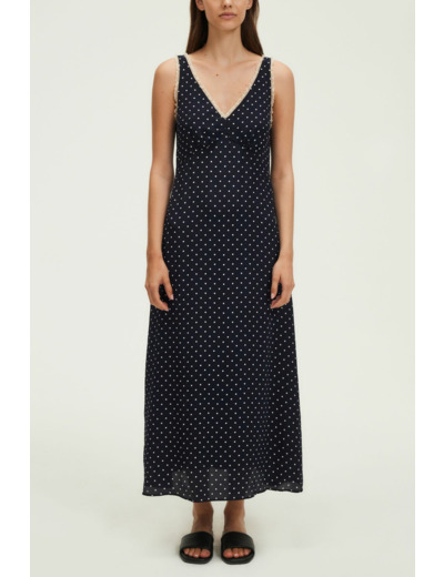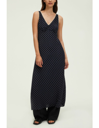 Robe longue sans manche à bretelles, forme cintrée, motif à pois. Matière légèrement brillante avec dentelle placée sur la poitrine. Col V décolleté. Fermeture zippée latérale. Marque Pablo.