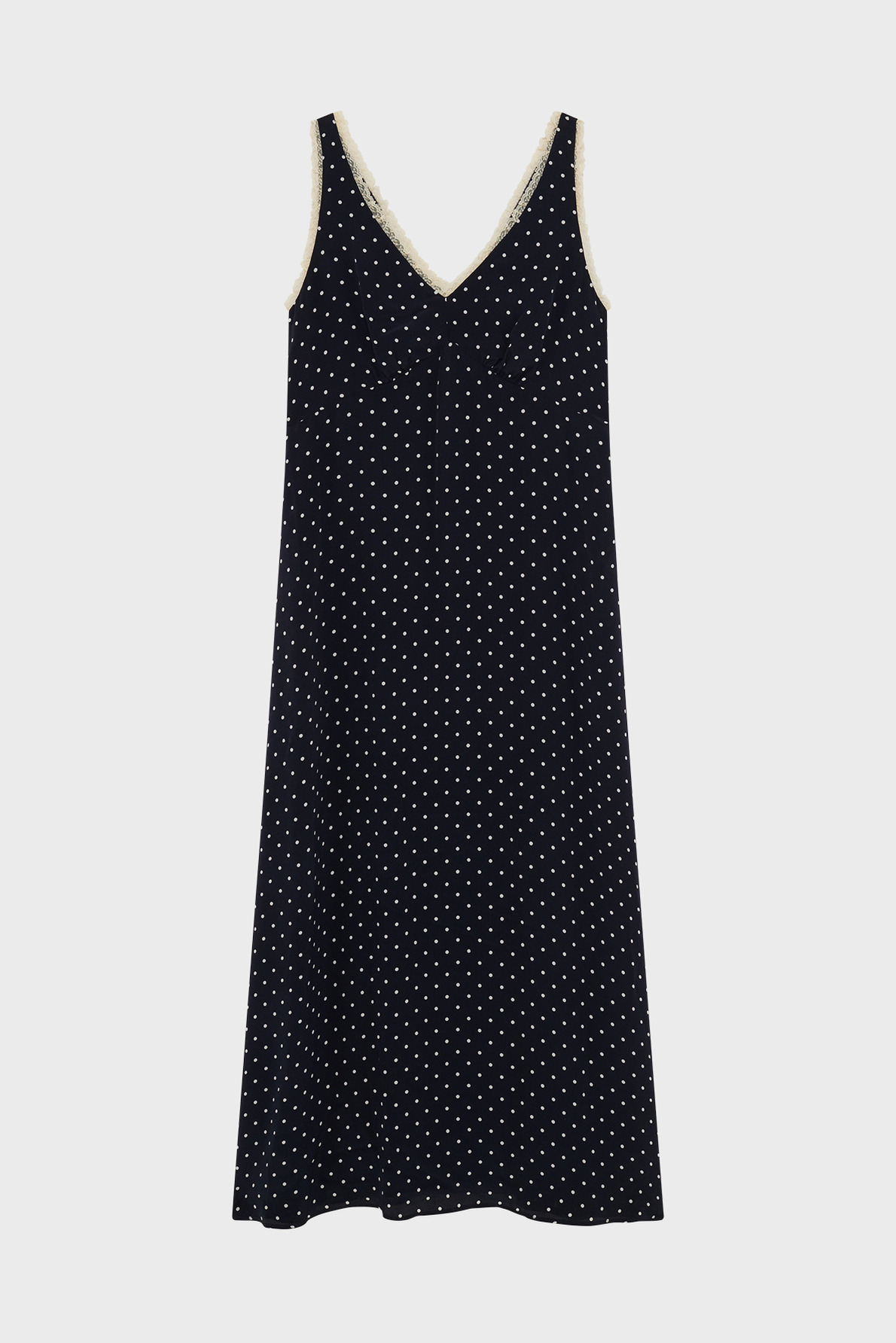 Conçue pour épouser parfaitement vos formes, cette robe cintrée met en valeur la poitrine grâce à un décolleté en V délicat et une dentelle placée avec soin. Les fines bretelles et l’absence de manches renforcent son allure légère et sophistiquée, tandis que le motif à pois apporte une touche rétro-chic intemporelle.
