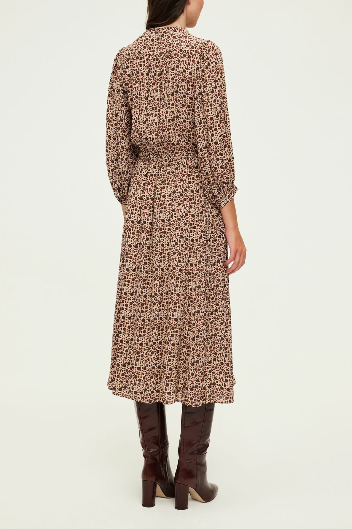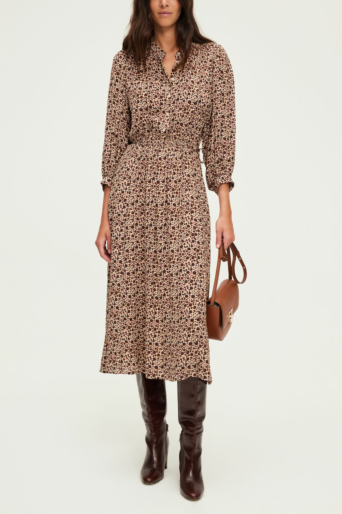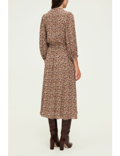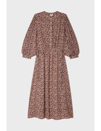 La robe Pablo séduit par sa coupe fluide et féminine, soulignée par une taille élastiquée et des liens ajustables qui dessinent la silhouette. Son col rond esprit officier et ses manches longues aux poignets boutonnés apportent une touche classique et sophistiquée. Le tissu à l’aspect plissé, associé au motif floral délicat, crée un mouvement léger et élégant, tandis que les poches discrètes insérées dans les coutures ajoutent une fonctionnalité discrète.