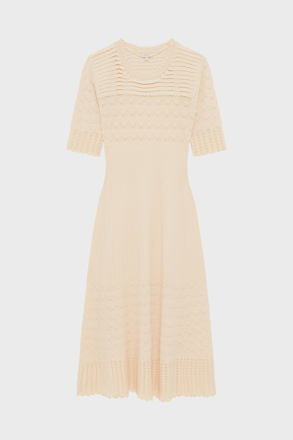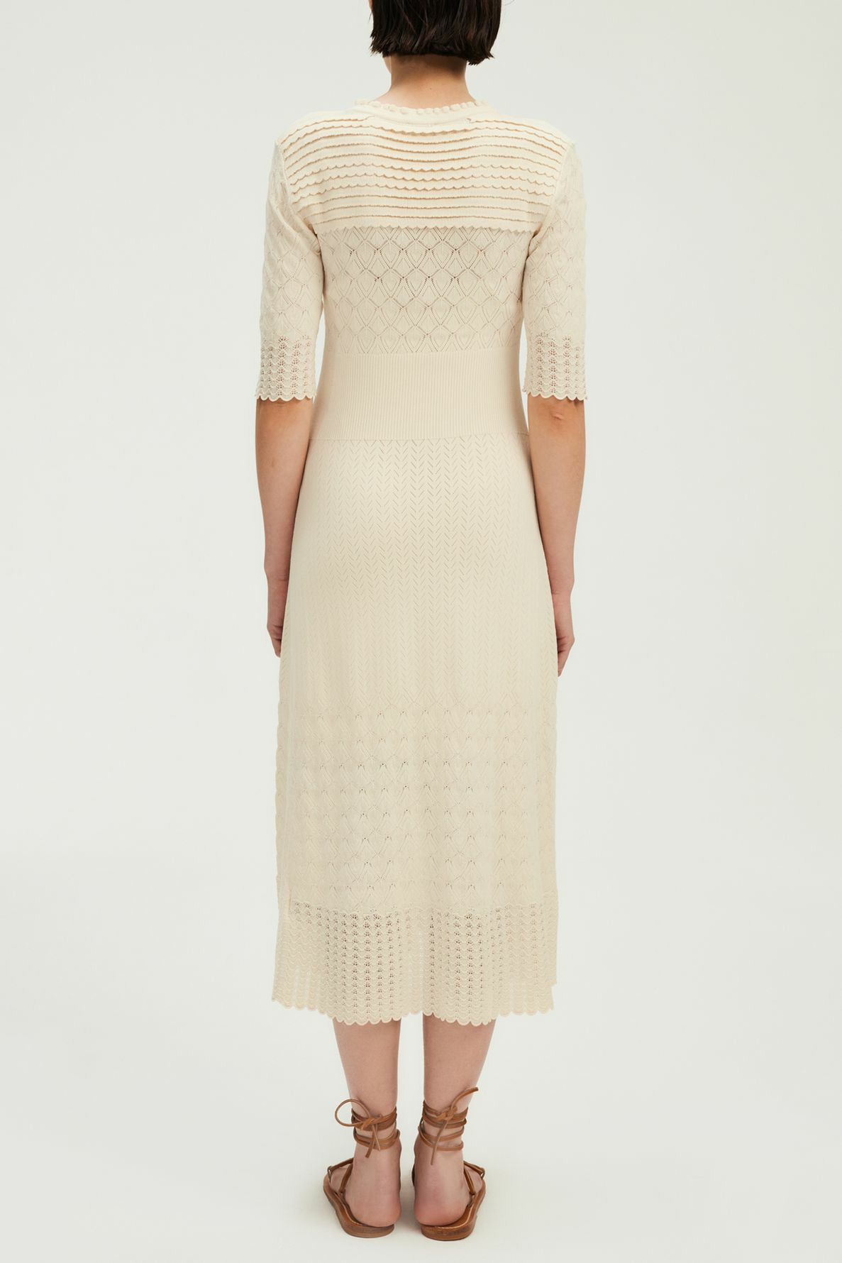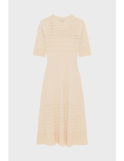 Robe midi en maille stretch à motifs géométriques, coupe cintrée avec bas évasé, col rond orné de petits volants, manches mi-longues, emmanchure classique, jeux de maille ajourée esprit dentelle, large bande côtelée resserrée à la taille, longueur midi.