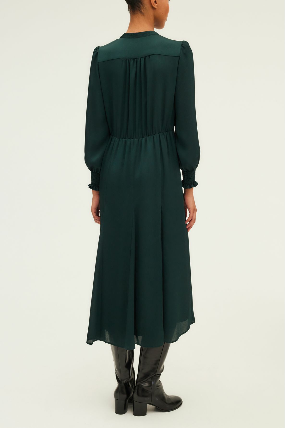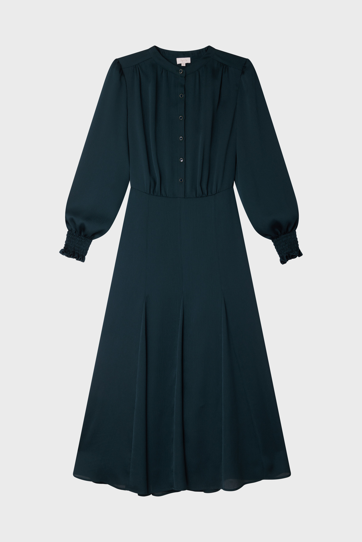Robe midi en tissu gaufré et satiné, forme cintrée, col rond avec boutons cerclés dorés, manches longues avec poignets élastiqués smockés, petits plis aux épaules et plis dans le dos. La mannequin mesure 180 cm et porte une taille 38.