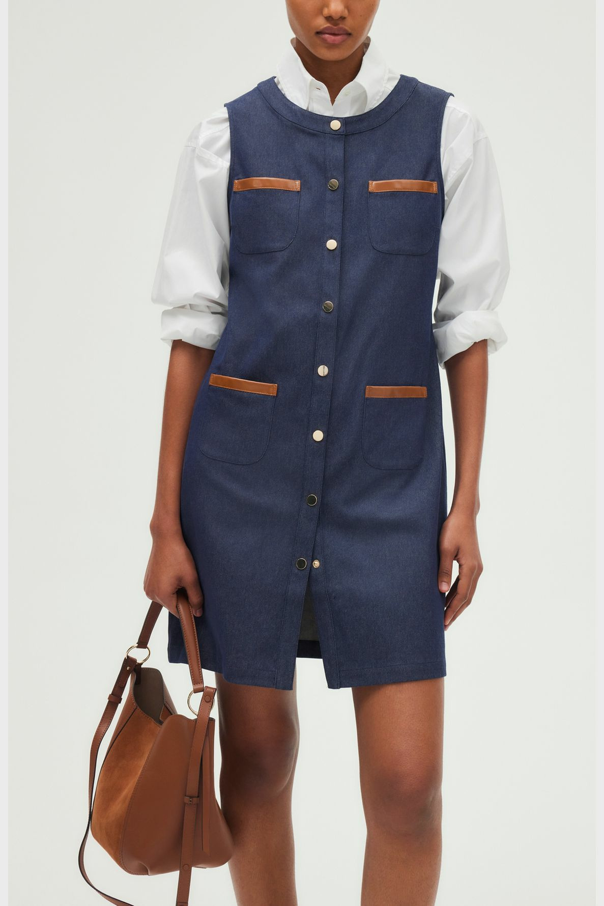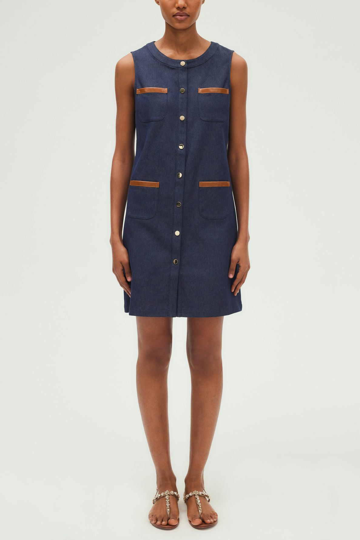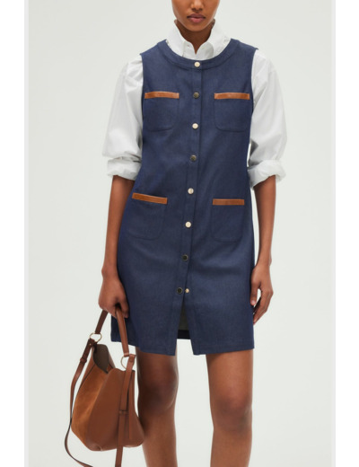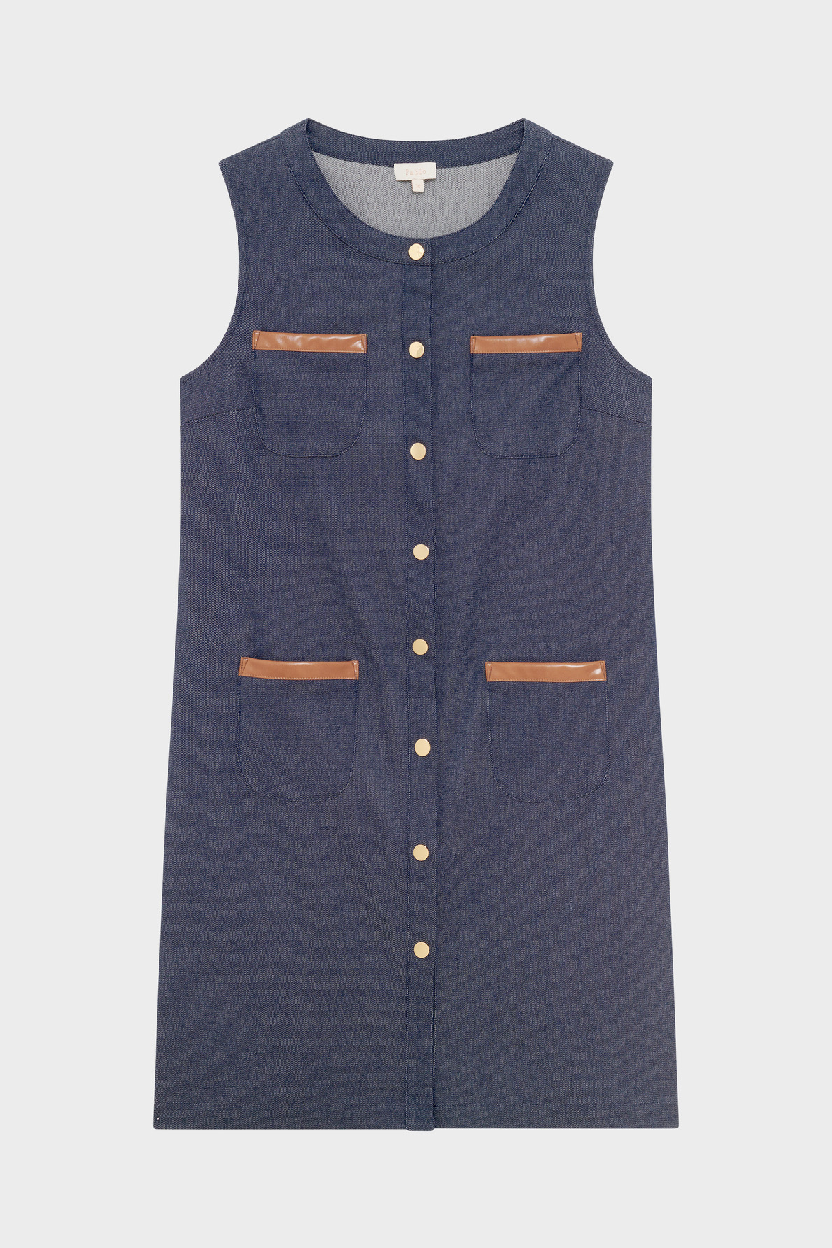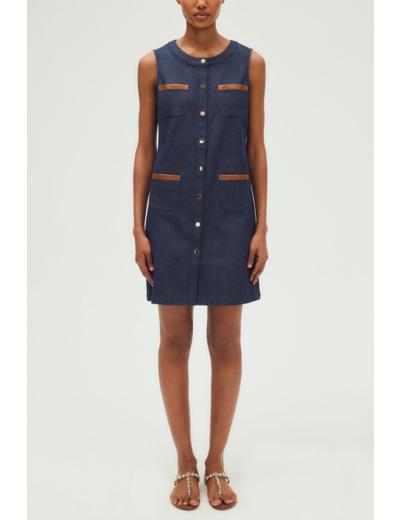 Robe courte sans manche, en matière esprit denim uni. Forme droite avec col rond. Boutonnage intégral sur le devant. Deux poches plates à la poitrine et deux poches plates à la taille. Détails en cuir sur les finitions pour une touche raffinée.