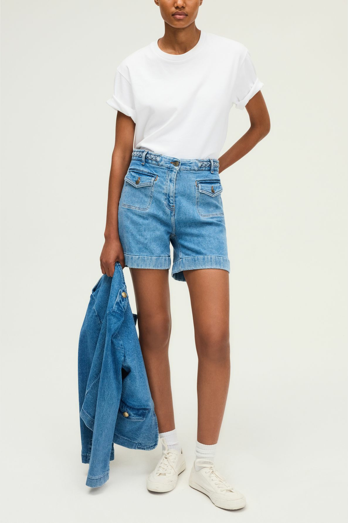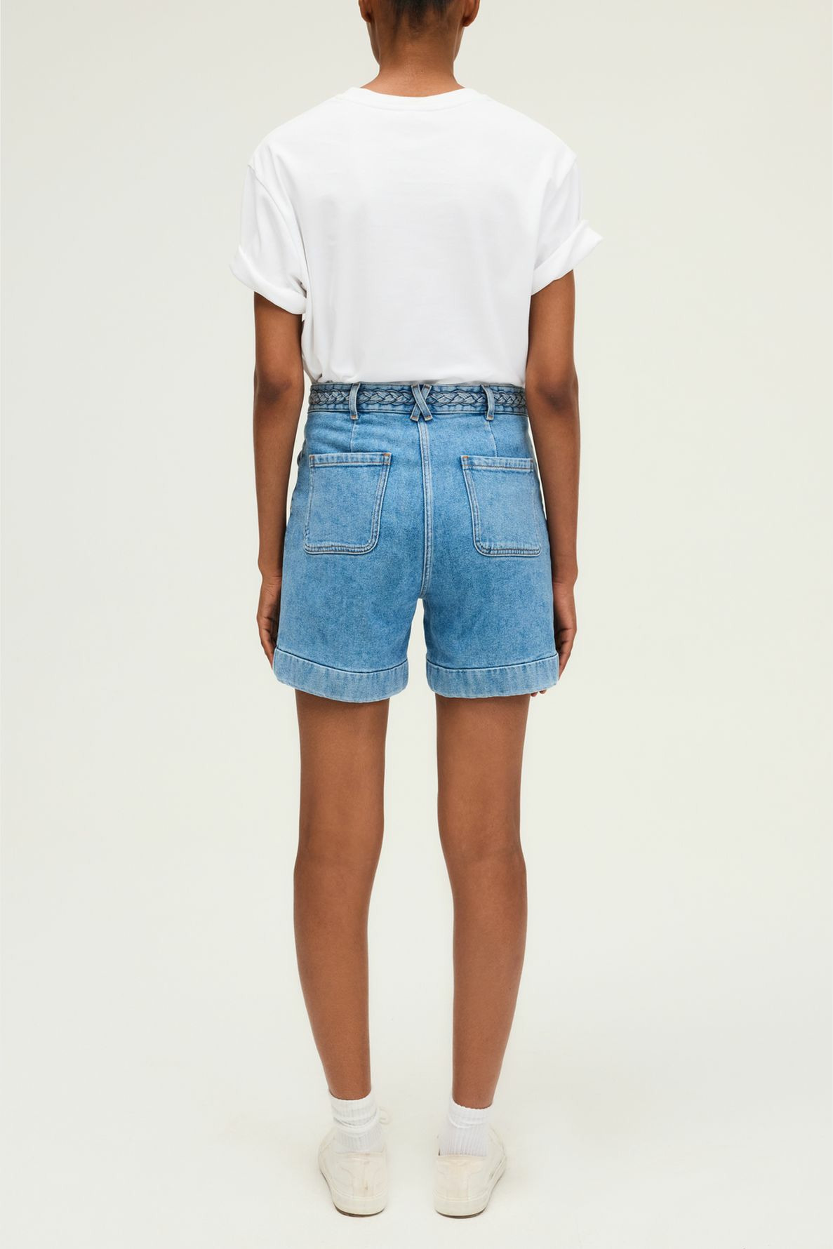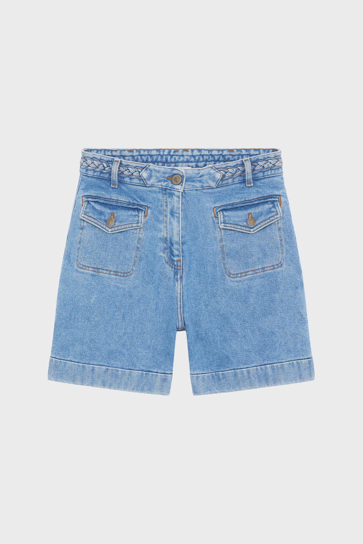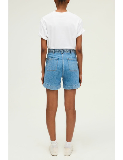 Short à la ceinture tressée en denim bleu jean, taille haute, coupe droite. Fermeture par bouton gravé et zip sous patte. Matière denim uni légèrement stretch. Short court avec poches plaquées et à rabat munies de boutons. Ceinture montée à la taille.