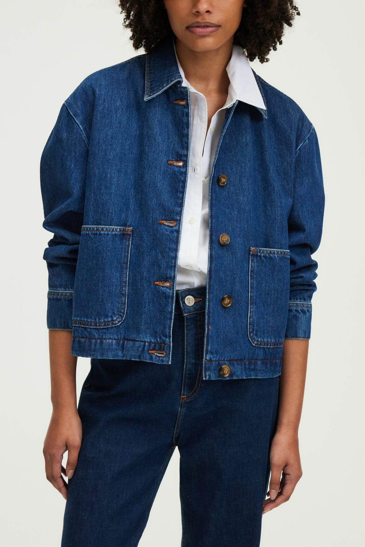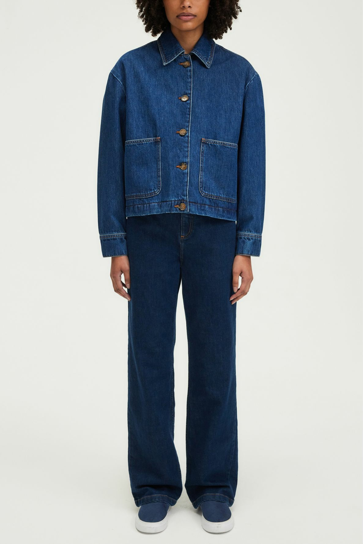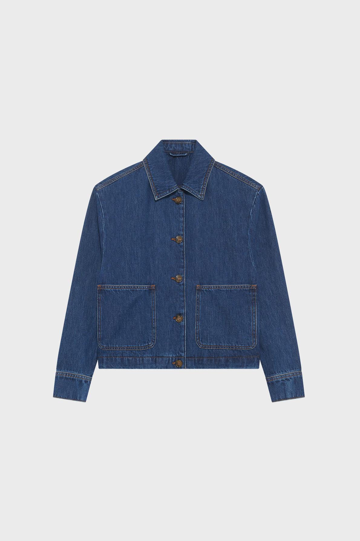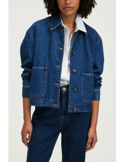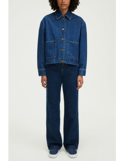 Fabriquée en denim brut uni 100% coton, elle se ferme par une rangée de boutons ronds esprit corne, assortis aux poignets. Sa forme droite et ample assure un tombé impeccable, tandis que les grandes poches plates renforcent son aspect utilitaire.
