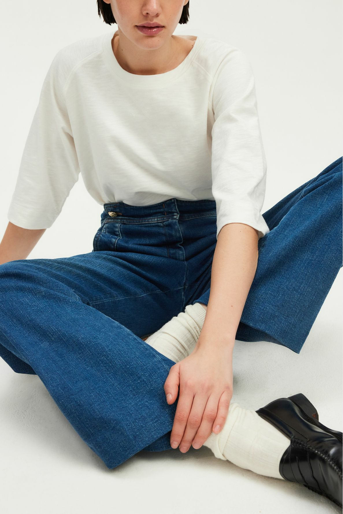 100 % coton flammé, coton uni, forme droite, volume ample, longueur standard, emmanchure raglan, col rond, manches mi-longues, surpiqûres ton sur ton.